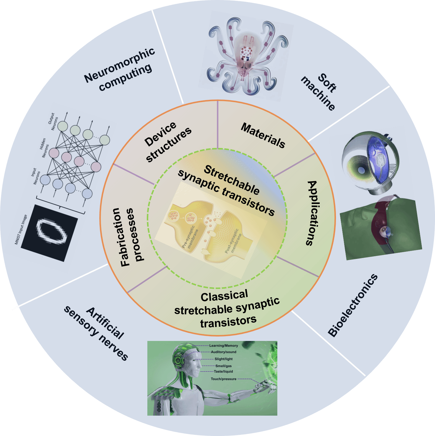 可拉伸突触晶体管具有良好的形变能力、优异的生物兼容性和可低温溶液法加工等特点,在神经形态电子领域(如,可穿戴计算、软体机器人和仿生电子等)受到了广泛关注。与传统两端突触器件相比,可拉伸突触晶体管因其并行处理信息和记忆功能的优势,更适合用于模拟生物突触等,是神经形态电子领域的关键技术。