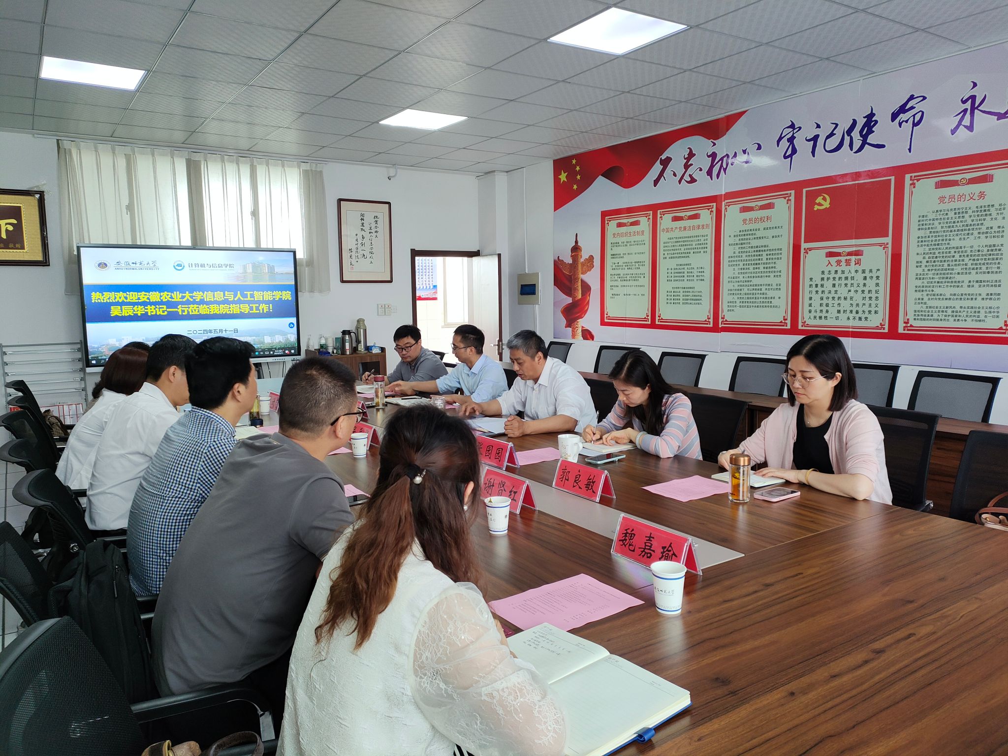 在安徽师范大学,计算机与信息学院党委书记袁兴龙、院长罗永龙、党委副书记张园园、副院长接标等就党建融合事业发展、学科建设和教育教学改革情况、团学工作进行详细交流。