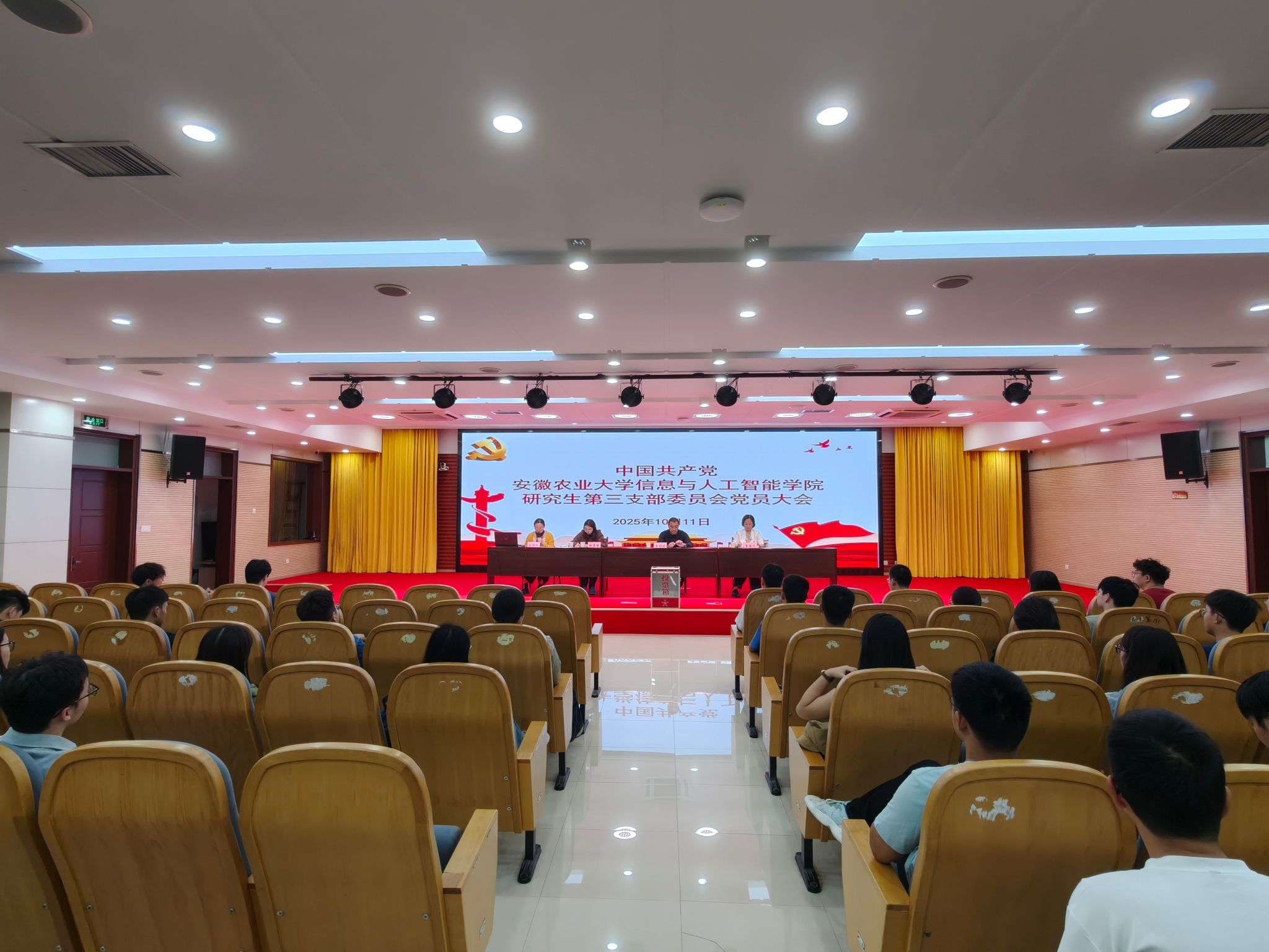 本网讯 10月11日上午,信息与人工智能学院研究生第三党支部召开全体党员大会,圆满完成了第一届支部委员会委员的选举工作。校党委研究生工作部、研究生院副部长、副院长吕剑秋,院党委副书记、纪委书记李南飞出席会议。大会在雄壮的国歌声中拉开帷幕。