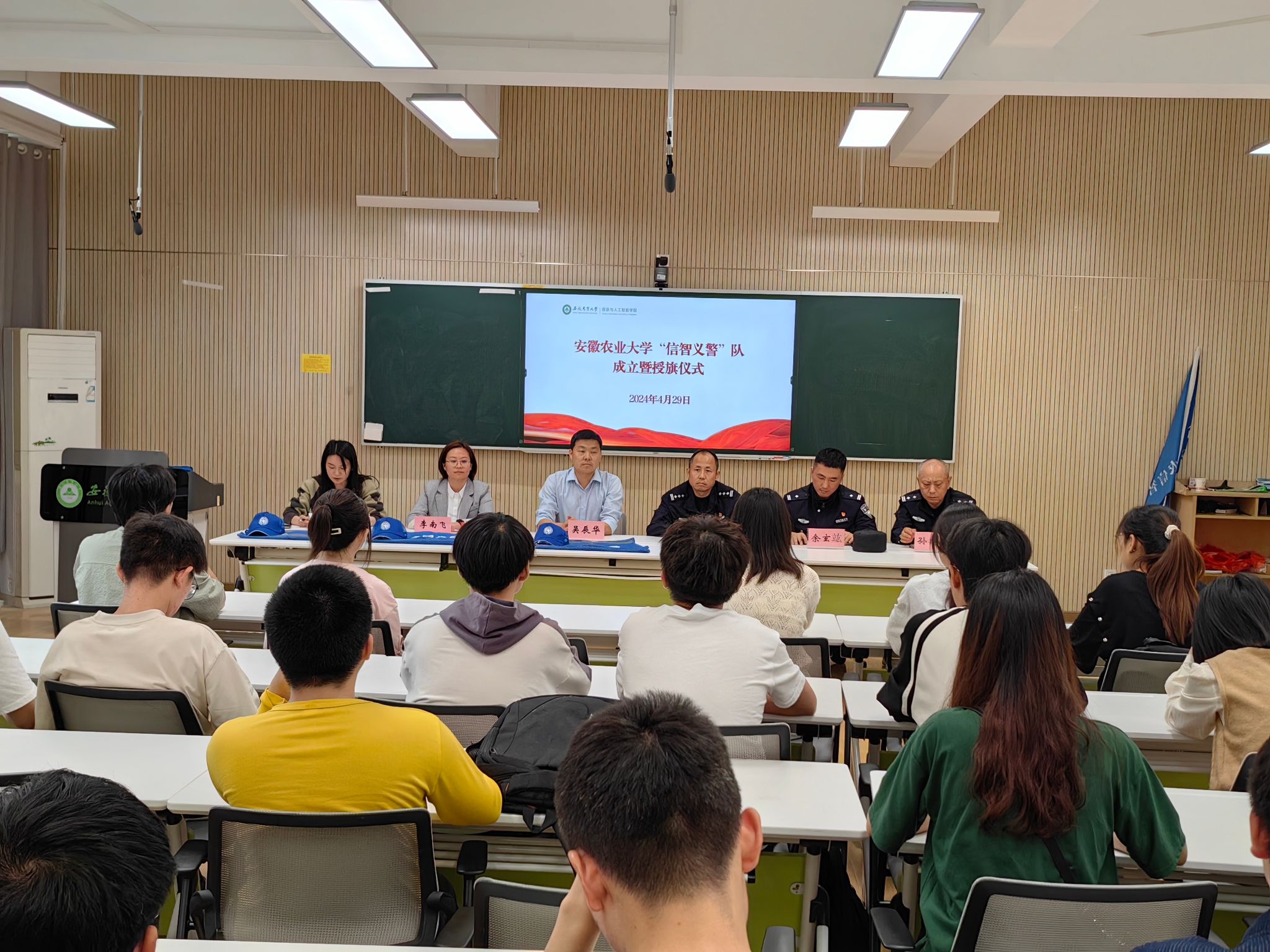 本网讯 4月29日下午,信息与人工智能学院在学院305教室举行安徽农业大学“信智义警”队成立暨授旗仪式。琥珀派出所所长刘龙、副所长余玄竑、社区民警孙建民、院党委书记吴辰华老师、院党委副书记李南飞老师参加会议。