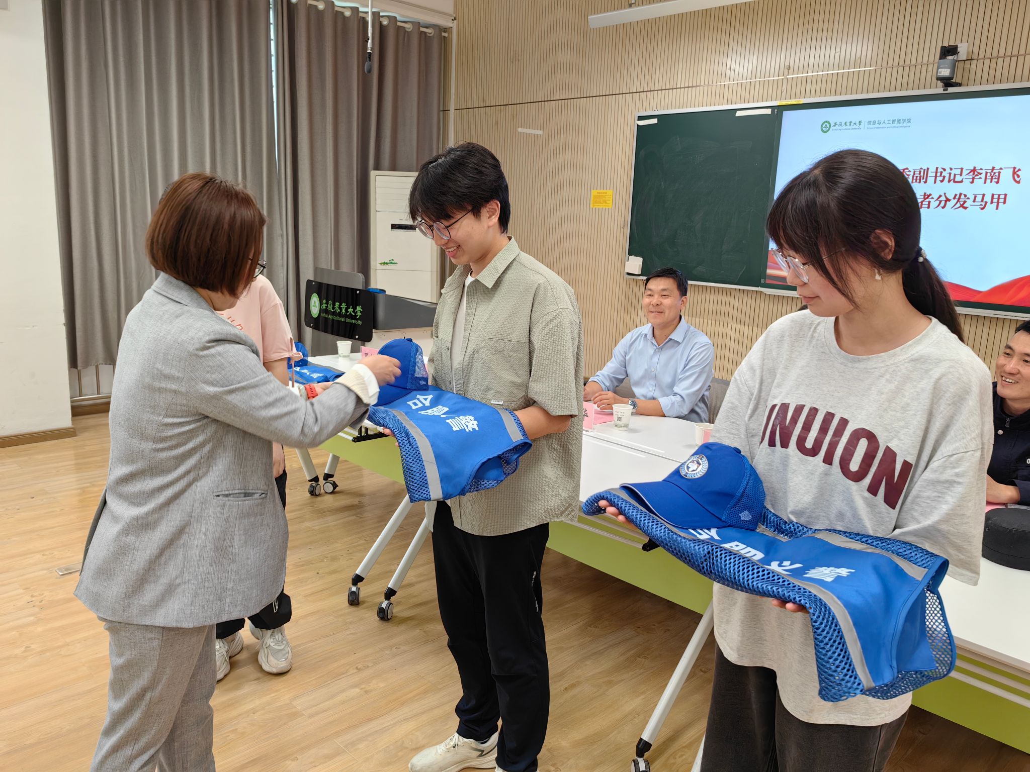 会上,吴辰华宣布“信智义警”队成立,并对学生们提出三点要求:一是要求志愿者们倡导绿色用网,积极宣传预防电信诈骗,共同营造安全用网环境;二是要求志愿者们服从警务人员和带队老师管理,积极履职尽责,发挥学生代表榜样作用;三是要求志愿者们认真学习法律法规,严格遵纪守法,向更多人开展普法教育,传递正能量。刘龙为“信智义警”队志愿者代表授予队旗,余玄竑对义警工作提出要求,李南飞为学生代表分发马甲。