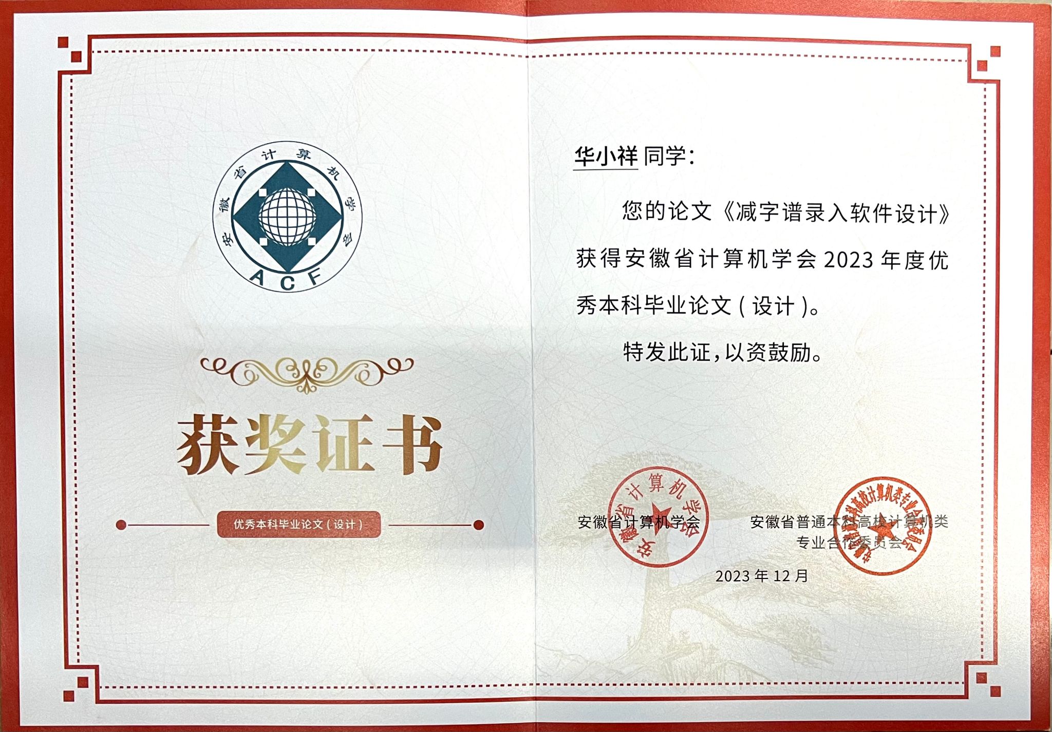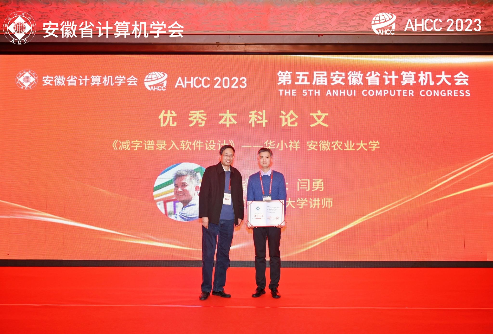本网讯 近日,由安徽省计算机学会主办的第五届安徽省计算机大会(AHCC 2023)在铜陵学院举行。会议期间,主办方公布了2023年安徽省优秀本科生毕业论文(设计)获奖名单,信息与人工智能学院2019级计算机科学与技术专业华小祥同学的毕业论文《减字谱录入软件设计》获评为优秀本科毕业论文。论文指导老师闫勇作为代表接受了安徽省计算机学会的颁奖。