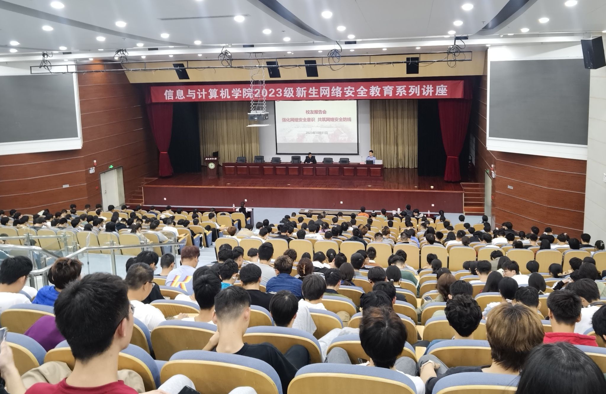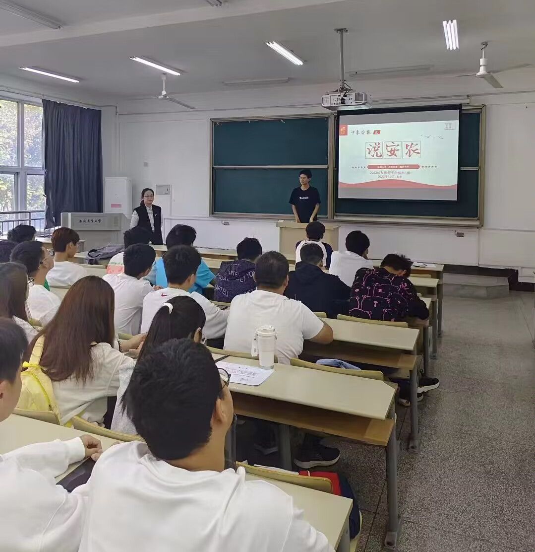 网络安全教育“第一课”网络安全是当前亟待关注的问题,大学生作为网络使用的主力军,更应该加强对网络安全的认知。为引导大学生安全用网、绿色用网,学院先后邀请我院校友、合肥市公安局网安支队副支队长朱剑宇,蜀山区琥珀派出所民警孙健民,学院教工第二党支部书记汪益民老师分别为2023级新生开展各类网络安全知识教育,帮助学生树牢国家安全意识,提高风险防范能力,筑牢防范网络电信诈骗壁垒,为每一位新生种下“安全的警钟要长鸣”的种子。