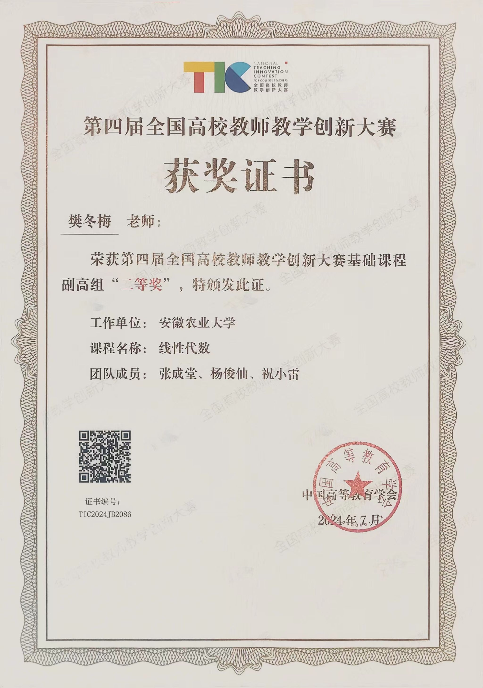 本网讯 近日,由教育部高等教育司指导、中国高等教育学会主办的第四届全国高校教师教学创新大赛全国赛在电子科技大学举办。我院樊冬梅教师团队凭借坚定的教育初心、扎实的教学基本功和出色的现场表现,从全国赛的483门课程的1779位教师(含团队教师)中脱颖而出,获得基础课程副高组全国二等奖。