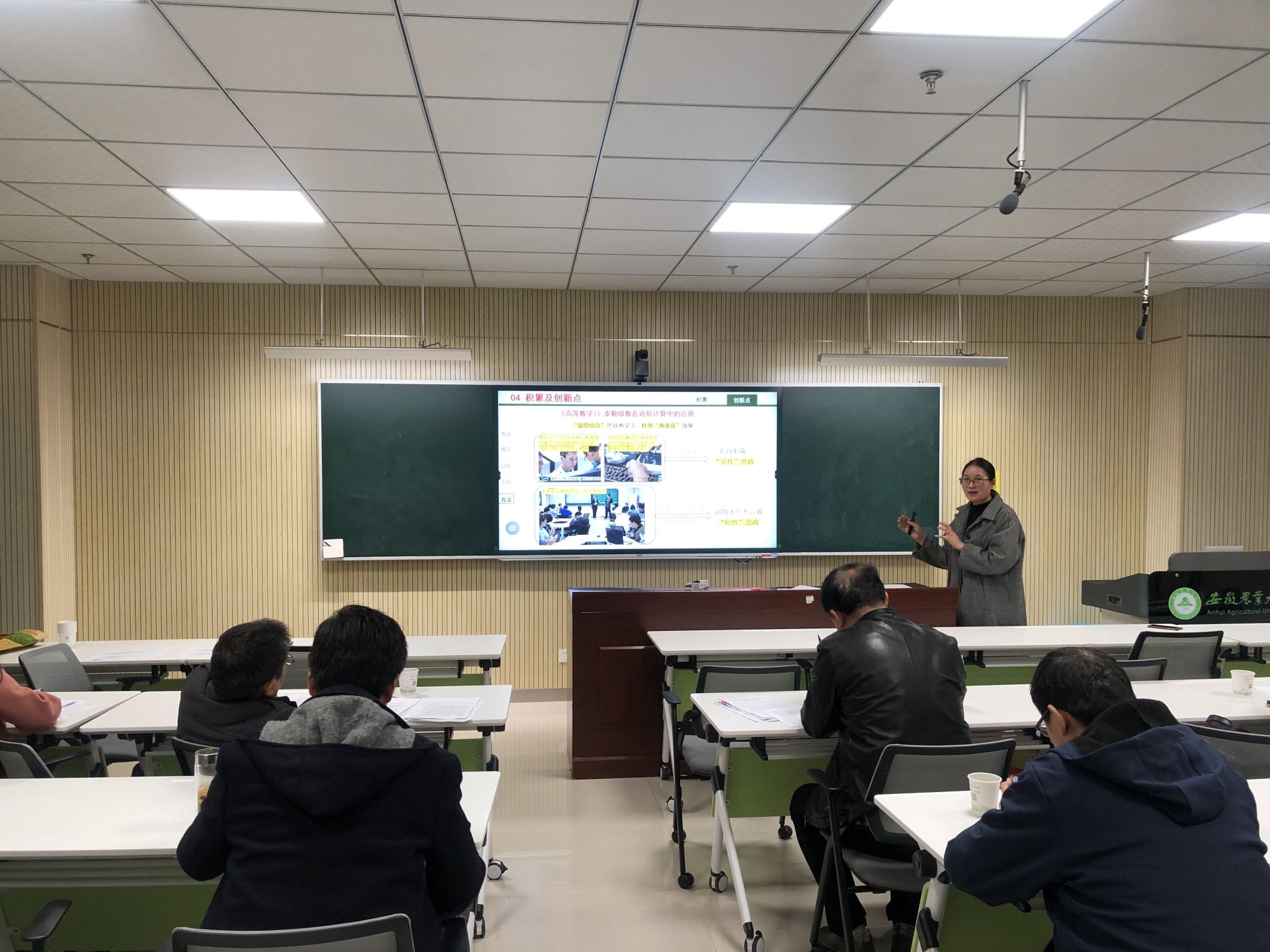 本网讯 11月18日,理学院首届“课程思政”教学竞赛在中西部楼649智慧教室举行,共有3组教师参赛,分别是正高组钱良存团队、副高组宋春霞团队、中级组谢宝英团队。人文社会科学学院院长黄洪雷、马克思主义学院副院长袁修雨等五人担任评委,教务处副处长徐峰现场指导,学院其他教师积极到场观摩,竞赛由张成堂副院长主持。