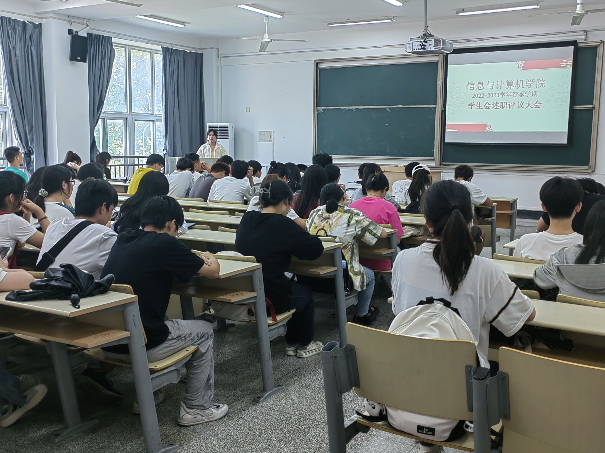 本网讯 6月14日,信息与计算机学院2022-2023学年春季学期学生会(研究生会)述职评议大会在信计楼204教室和中西部实验楼779会议室开展。学院团学工作负责老师以及学生代表近80人参与了述职大会。