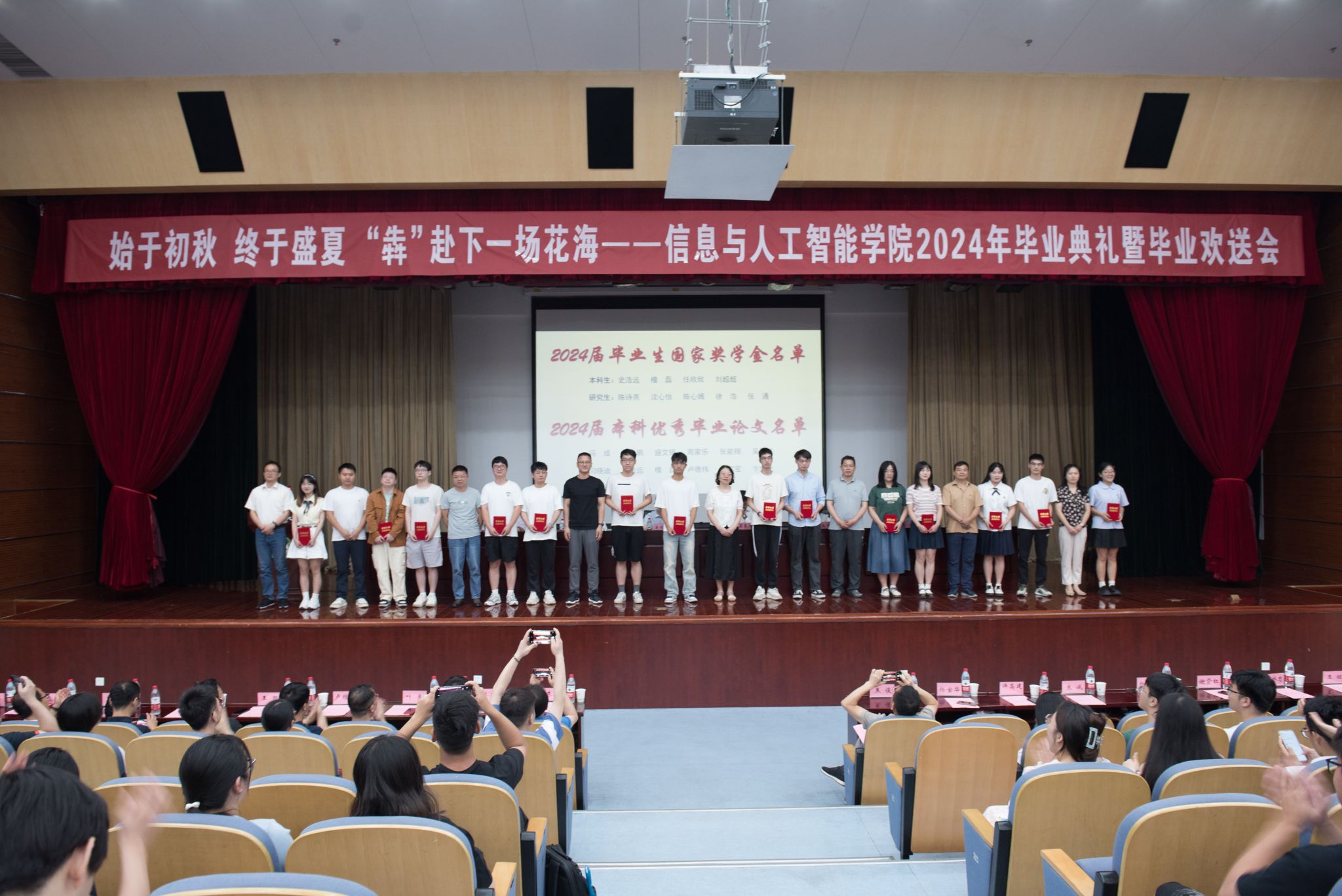 学院副院长张成堂宣读获得省级优秀毕业生称号的学生名单,学院副院长饶元宣读国家奖学金、本科优秀毕业论文获得者名单,学院教师代表为获奖学生颁奖。