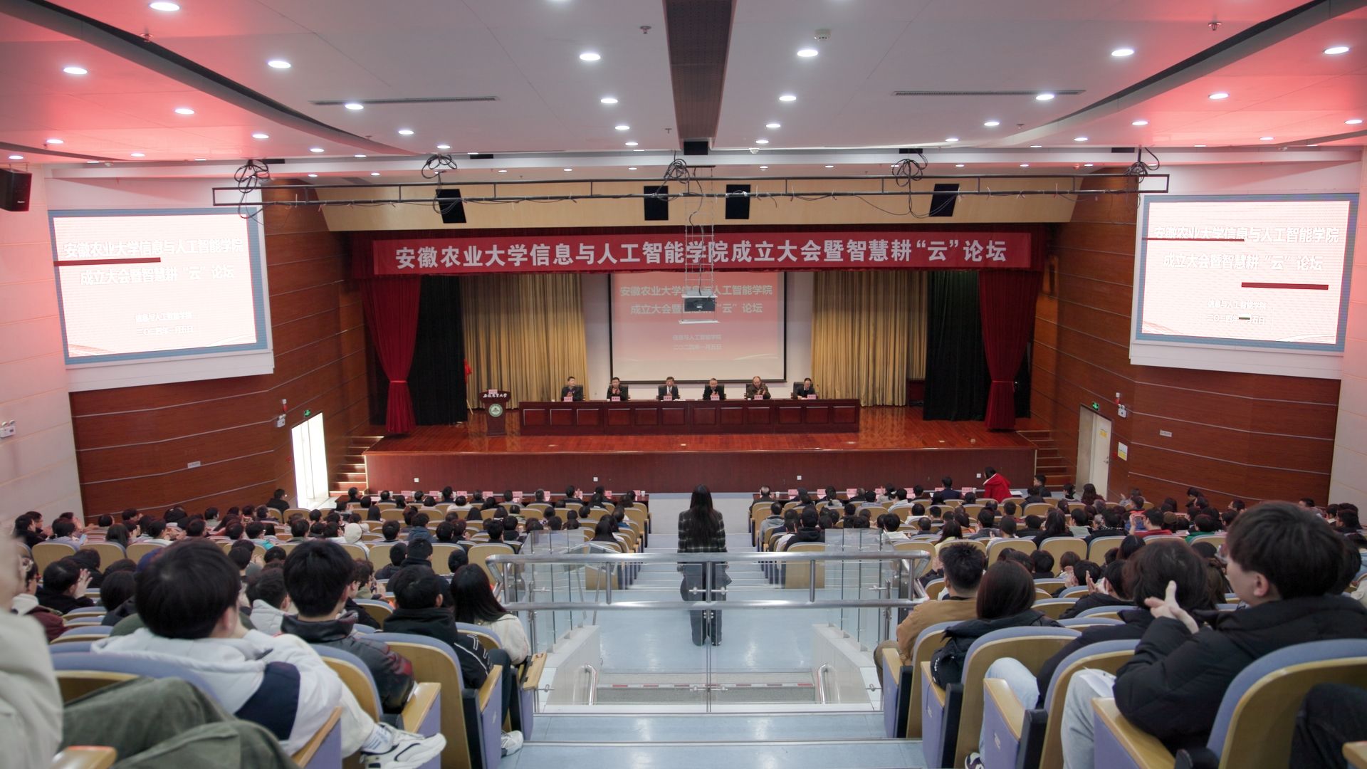 本网讯 1月5日,信息与人工智能学院在图书馆一号报告厅举行成立大会暨智慧耕“云”论坛。中国工程院院士杨善林,安徽省计算机学会理事长陈恩红,安徽省高校计算机教育研究会理事长胡学钢,以及来自中国科学技术大学、合肥工业大学、安徽大学、安徽理工大学等高校相关学院和中国广电安徽网络股份有限公司、北方雷科安徽科技有限公司、阳光新能源开发股份有限公司、科大讯飞股份有限公司等企事业单位负责人受邀参加成立大会。校党委常委、纪委书记、监察专员陈文兵出席会议并致辞。学院党委书记吴辰华主持会议。为学院改革发展付出辛勤努力、拼搏奉献的历任领导、离退休老同志,全体教职员工和部分研究生、本科生代表参加会议。