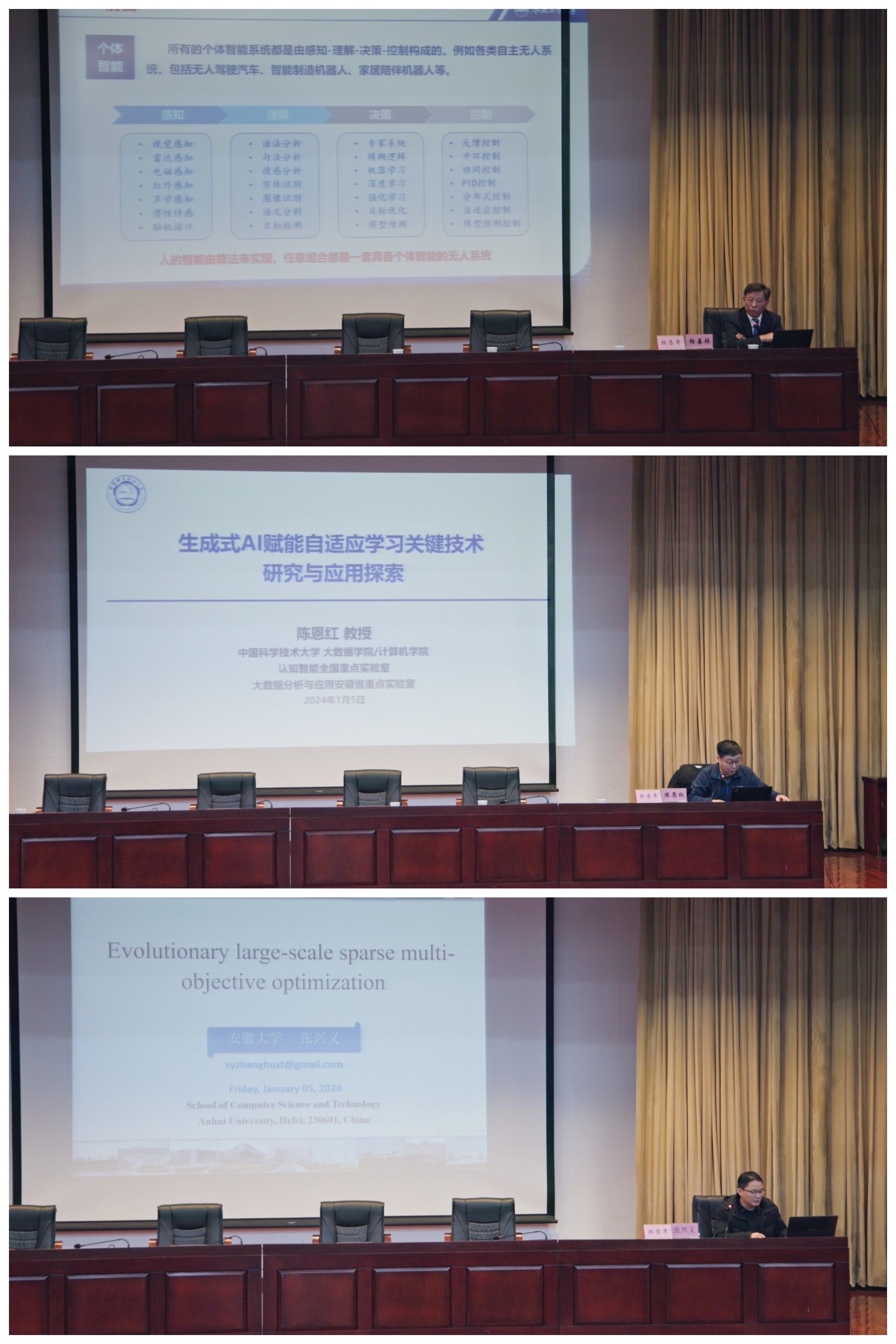 成立大会后,杨善林院士、陈恩红教授、张兴义教授分别作了题为《AIGC的科学基础与涌现机理研究》《生成式AI赋能自适应学习关键结束研究与应用探索》《Evolutionary large-scale sparse multi-objective optimization》的学术报告,从人工智能、大数据分析及应用、机器学习、科技创新等不同维度,围绕技术创新、算法性能、智能学习等方面畅谈体会、分享经验。