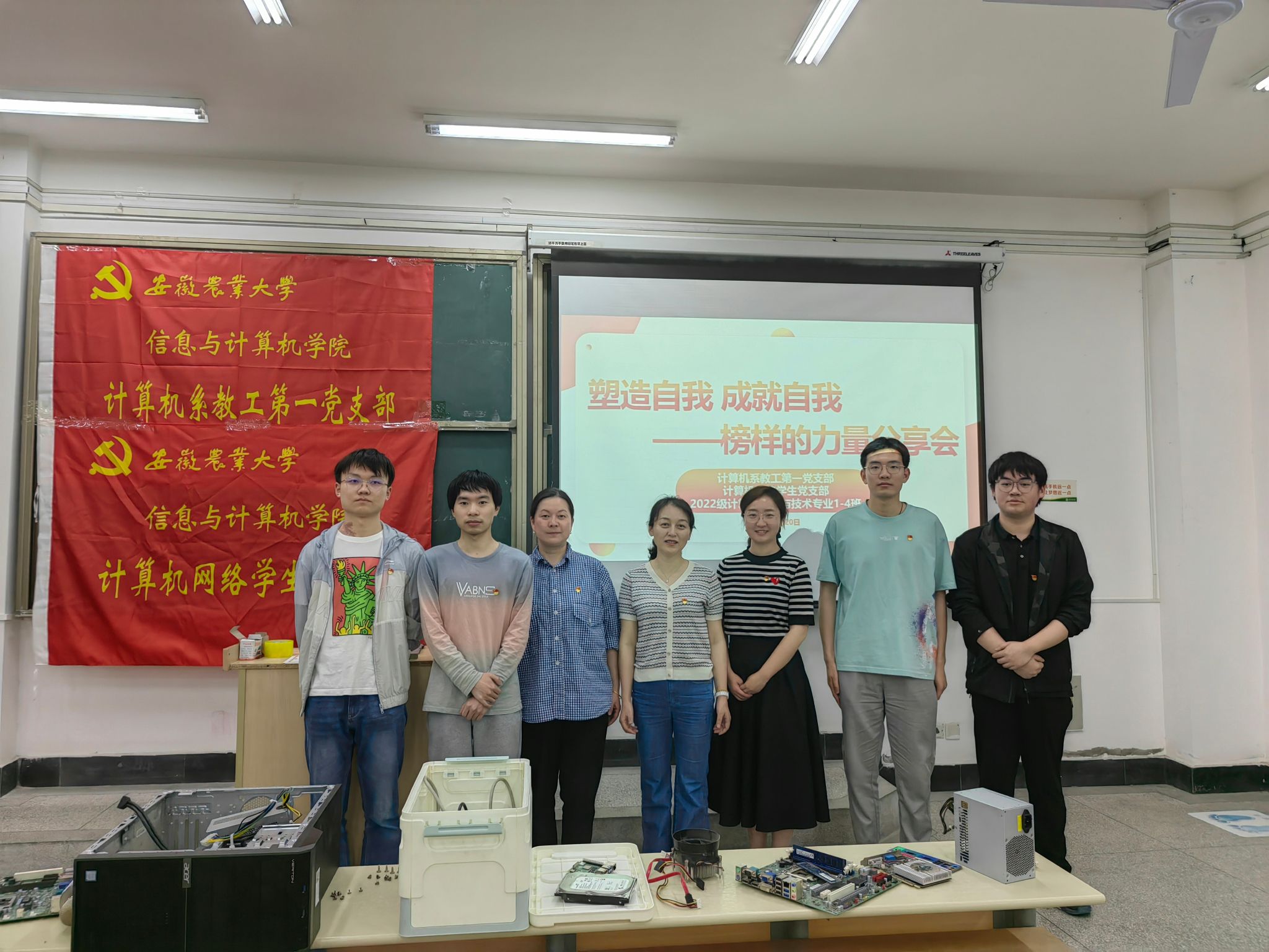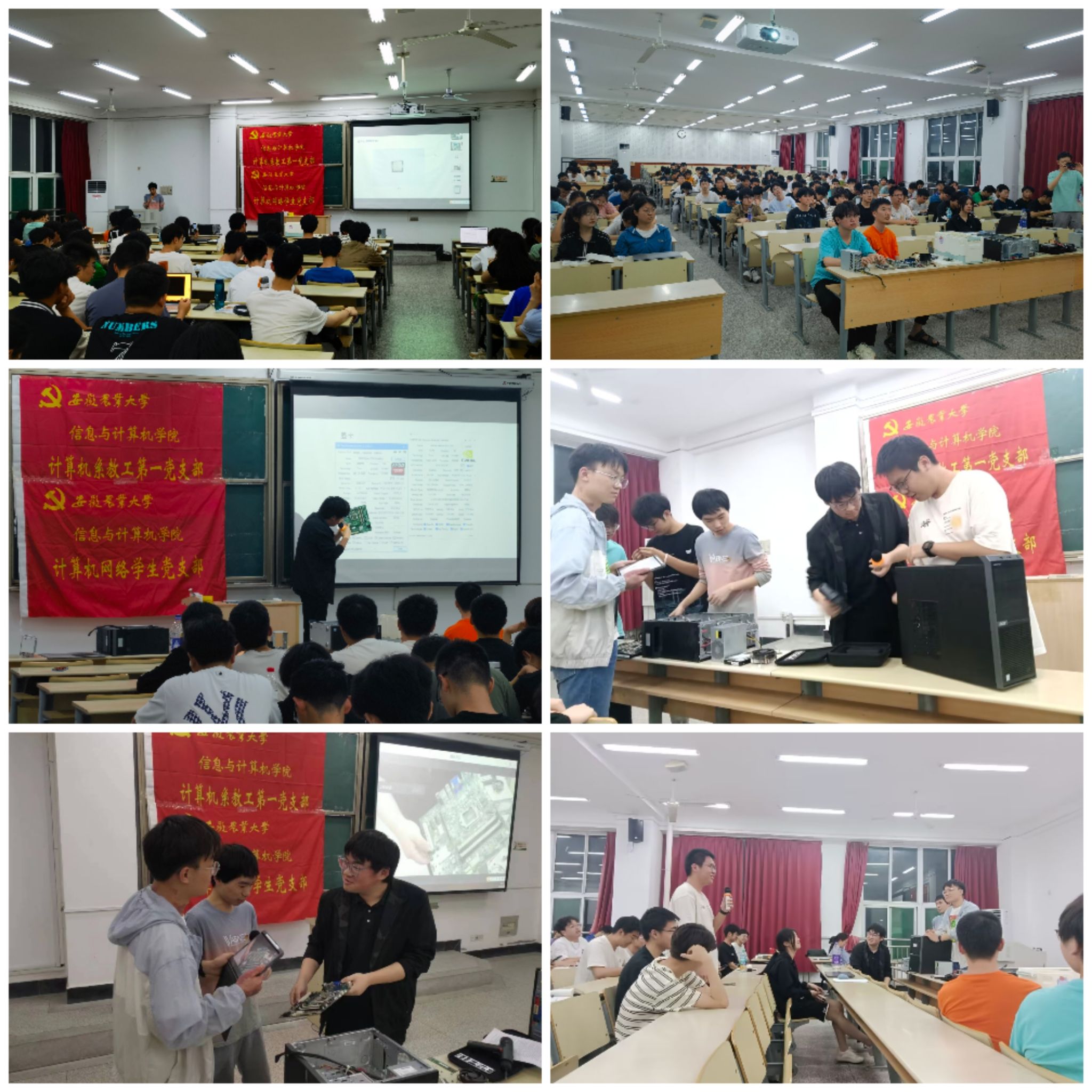 活动伊始,计算机系教工党支部书记吴云志老师结合党的二十大报告中关于数字中国、网络强国的建设目标,向同学们介绍了计算机硬件与体系结构的发展背景,阐述了计算机硬件技术在计算机专业学习中的重要性,引导学生建立对计算机硬件整体的认识。计算机网络学生党支部党员现场为同学们展示了计算机组装维护的实践操作,并结合经验详细讲解了组装和维护过程中需要注意的事项。学生党员深入浅出的讲解使同学们对计算机硬件有了更加深刻的理解,现场气氛活跃,同学们积极动手实践。“本次专业实践活动让我对计算机硬件的组装和维护有了更加清晰的认识,充分激发了我对专业的学习兴趣,未来我要在掌握理论知识的基础上,更加注重动手能力和实操能力。”计算机科学与技术专业4班陈琼有感而发。活动期间还开展了“塑造自我、成就自我”——榜样的力量分享会,计算机网络学生党支部推免生徐淳和2020级计算机科学与技术专业王浩宇分别分享了各自加入实验室团队、参与学科竞赛的经历、收获与体会。