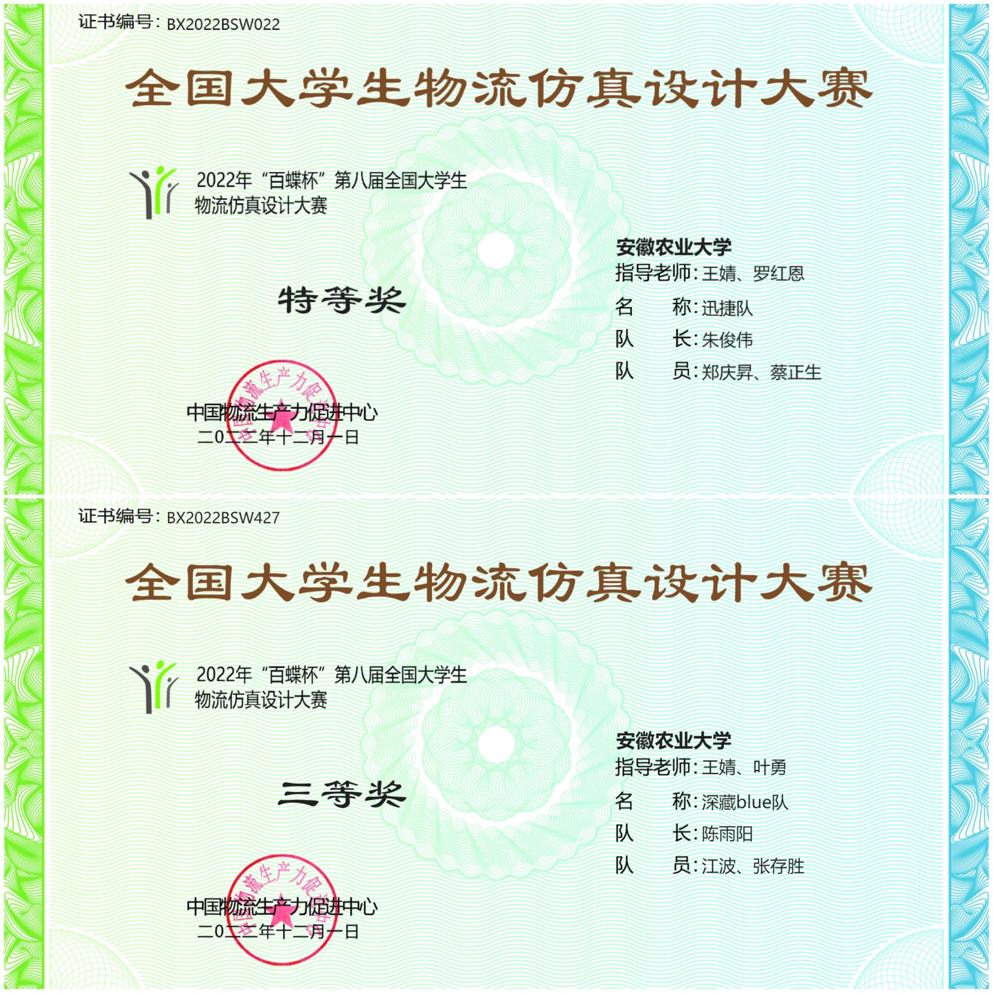 本网讯 近日,“百蝶杯”第八届全国大学生物流仿真设计大赛决赛成绩揭晓,我校信息与计算机学院王婧、罗红恩老师指导的2020级物流工程专业朱俊伟、郑庆昇和蔡正生等同学组成的“迅捷队”荣获特等奖,王婧、叶勇老师指导的2021级物流工程专业陈雨阳、江波、张存胜等同学组成的“深藏blue队”荣获三等奖。