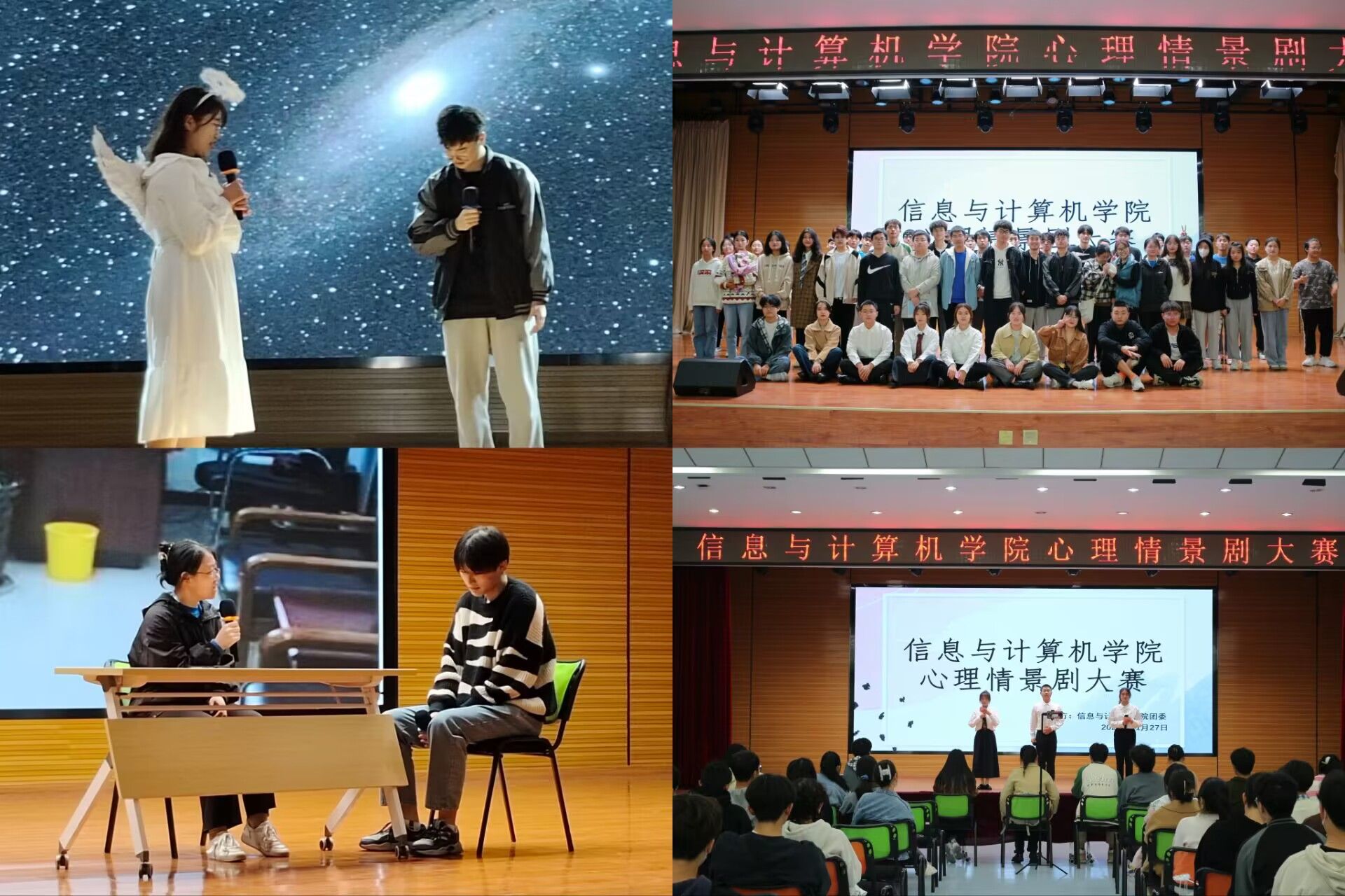 10月上旬起,我院面向全体学生组织开展了心理情景剧大赛。经过推荐选拔,共有5支代表队进入决赛。11月27日,我院在欣苑学生活动中心以线上线下相结合方式拉开心理情景剧帷幕。决赛现场,各代表队通过方寸小舞台,释放心灵空间,演绎青春大舞台。舞台上,演员们将大学生的生活、学习、人际交往中的心理冲突、烦恼、困惑等表现出来,从中体验心理的细微变化,进而达到宣泄、释压、升华。最后,经过激烈角逐,院学生分会代表队《拨云》摘得桂冠,2021级电子信息类专业代表队、2021级计算级科学与技术5-7班代表队斩获二等奖。2022级计算级科学与技术专业代表队、2022级电子信息类专业代表队荣获三等奖。