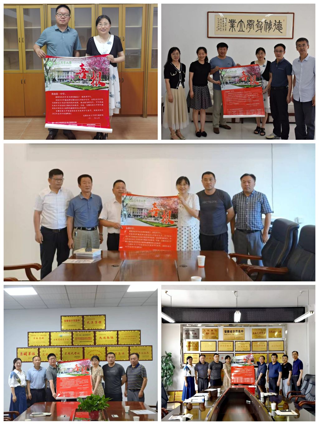 喜报送到5所中学。学院先后将76位2022届我院生源基地中学校友的考研喜报送到了太湖中学、宿松中学、宿松程集中学、淮南一中、淮南二中5所优质生源基地中学,受到了生源基地中学的热烈欢迎。