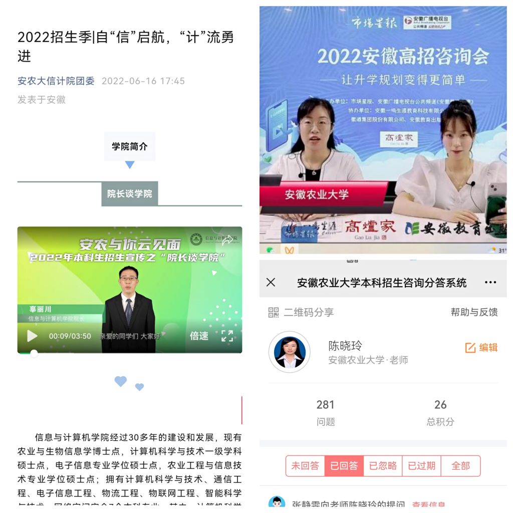 线上宣传多路径开展。学院提早谋划,全力拓展线上宣传路径,丰富宣传内容。精心打造“院长谈学院”宣传片,“学长(姐)谈专业”全专业覆盖,选派招生宣传骨干参与市场星报、安徽广播电视台主办的安徽高招咨询会线上直播,全天候在线高招分答系统,接听咨询热线,目前已实现网站、微信公众号、网络直播、B站、热线电话等多路径线上咨询网络覆盖。(陈晓玲 通讯员:孙光旭)