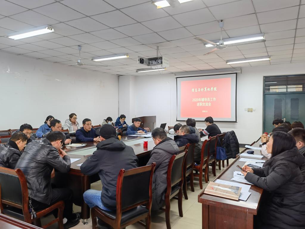 本网讯 12月底,信息与计算机学院在学院406会议室召开2020年度辅导员工作述职暨经验分享交流会。学院党委副书记吕剑秋参加并主持会议,全院全体专兼职辅导员参加述职并就相关工作进行交流。