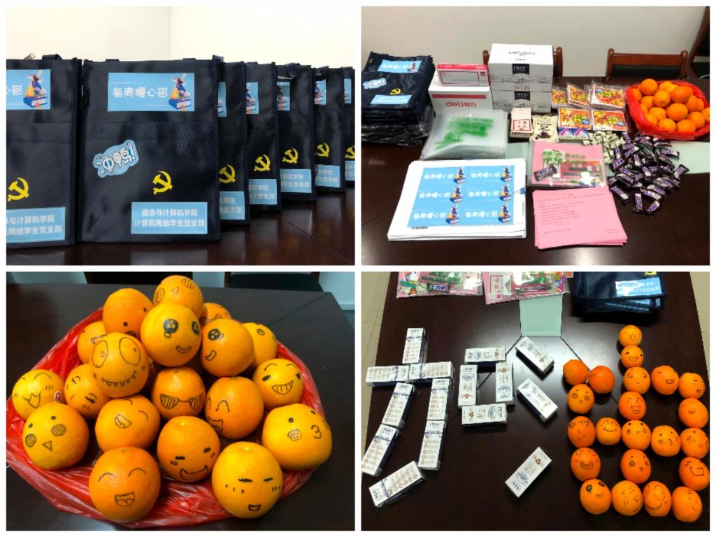 备考暖心包里为支部党员精心准备了一杯牛奶热饮、一个橙子、一袋考试用品、一块巧克力、一包暖宝宝、一份祝福语,希望考研学生们能“牛”气冲天、“脐”开得胜、心想“试”成、“苦”尽甘来、情“暖”寒冬、“诸”事顺意!