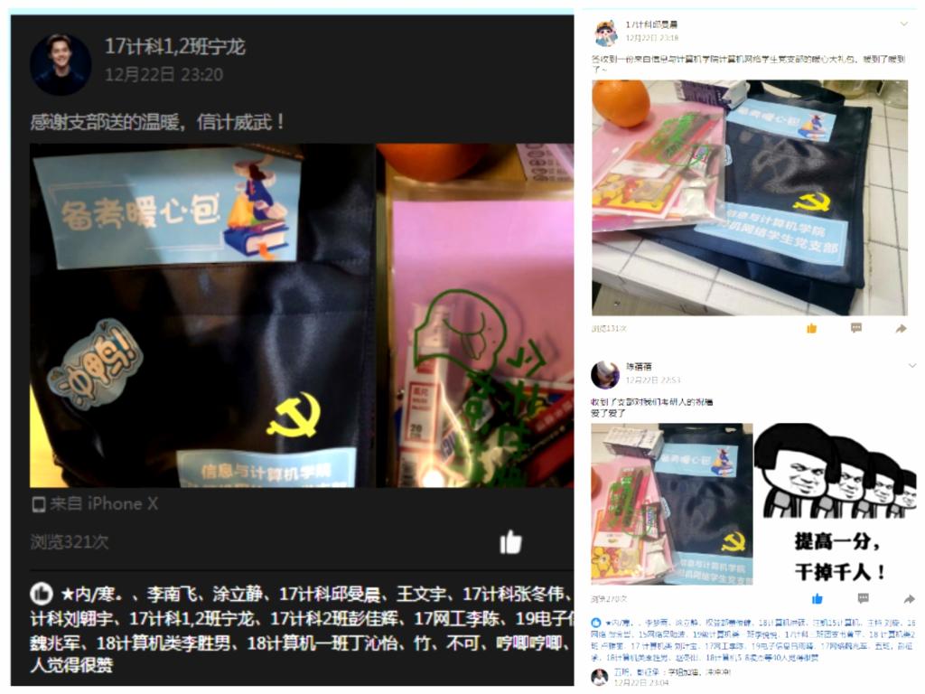 本网讯 近日,信息与计算机学院计算机网络学生党支部党员的说说被“支部备考暖心包”刷了屏。在2021年硕士研究生入学考试冲刺阶段,为鼓励支部毕业生党员积极迎考,支部特此开展了为考研学生党员送温暖活动。