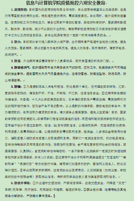 提供安全六教育,坚持底线思维。学院坚持把全体学生的生命安全和身心健康摆在第一位,分别从疫情防控、防火、防盗、防恶劣天气、防骗、防意外事故等六方面加强学生安全教育。通过QQ、微信、易班等网络平台,为学生提供破解诈骗套路,做好防范提示,用责任与爱心为学生提供安全知识、树立安全意识,为打赢疫情防控阻击战贡献力量。