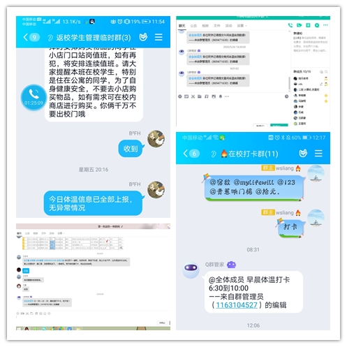 梳理健康总台账,精准核实排查。坚持每日对学生疫情防控信息日报情况进行精准摸排,建立返校学生QQ群,“一对一”“点对点”“人盯人”执行宿舍包保责任制,提醒学生按时完成晨、午、晚三次体温自测打卡填报,切实掌握每位在校学生的身体状况、流动去向及生活动态,及时准确向学院、学校上报信息,积极落实“日报告、零报告”制度,做到不漏报、错报、迟报。同时,制定在校学生流动工作台账,实时更新人数,有效形成严密的责任闭环、管控闭环、工作闭环。