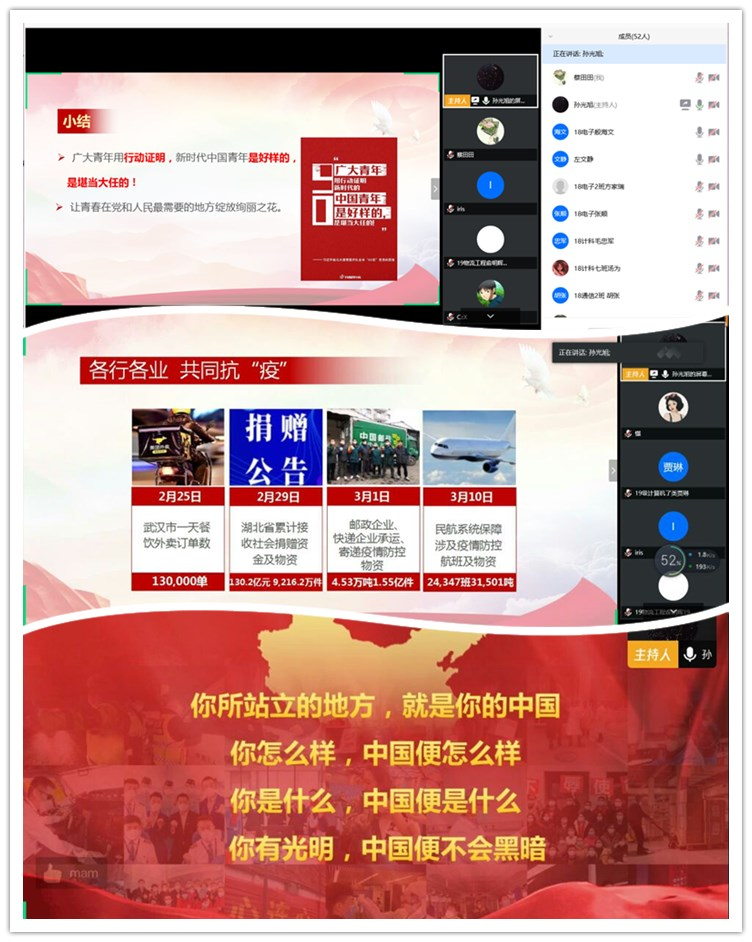 本网讯 为切实做好疫情防控期间“青马班”学员的教育引导工作,4月25日下午,信息与计算机学院在线上举行第一次理论学习暨“绽放战疫青春 坚定制度自信”主题团日活动,讲述战“疫”中的中国速度、中国精神、中国力量,全体学员参加了活动。