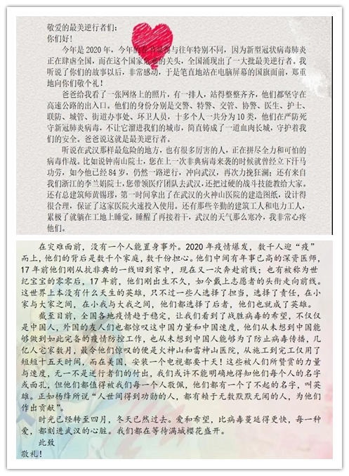 “山川异域,风月同天。”一线医务人员上演最美“逆行”,谱写出壮美的生命赞歌。“你们离开亲人,用自己的力量守护我们的平安,你们做的一切我们无以回报,在这里,我想要对你们说一声谢谢。谢谢你们的坚持,让我们感受到中国力量!”“鲁迅先生称赞舍身为民的人是‘中国的脊梁’,这些逆行者便是其中典型的代表,即使全身被汗水浸透,也绝不离开工作岗位。”“吹哨人李文亮,武汉市金银潭医院院长,钟南山、李文娟等等,皆是我辈之楷模。”同学们以书信的方式用一声声甜美的问候、一句句朴实的文字,寄托对逝者的追思,致敬最美逆行者。