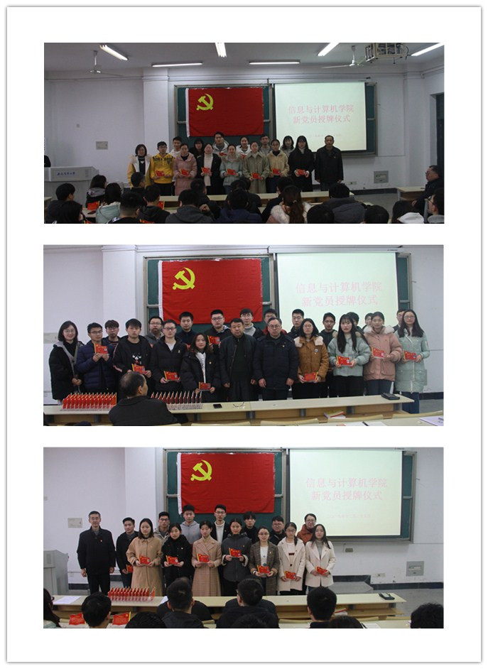 本网讯:12月25日,信息与计算机学院在学院302教室举行了2019年下半年新党员入党宣誓仪式。学院党委委员、学生党支部书记出席了宣誓仪式,全体学生党员参加了宣誓,仪式由学院组织员主持。