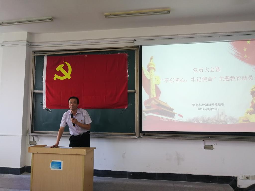 本网讯:9月23日中午,信息与计算机学院党委在学院302教室召开 “不忘初心、牢记使命”主题教育动员部署会,校主题教育第五督导组副组长、校工会主席、机关第三党总支书记张久辉和校第五督导组成员、校团委副书记(主持工作)任琪等到会指导,学院党政领导曹俊、张友华、张武、辜丽川和全体党员参加了动员部署会,会议由党委委员、副院长张武同志主持。