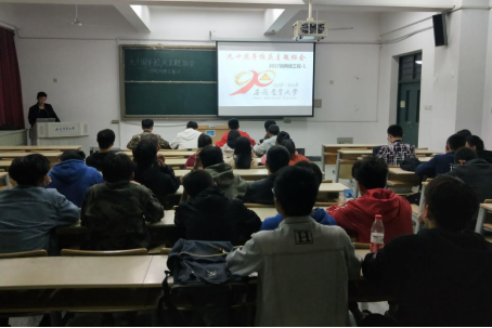 本网讯:为喜迎我校90周年华诞,10月21日晚,在学院团委的号召下,2017级网络工程一班全体同学在经技楼105教室开展了内容丰富的90周年校庆主题班会。