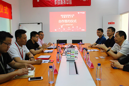 本网讯 2018年5月17日,信息与计算机学院与京东物流华东区域分公司完成校企合作揭牌及签约仪式。京东物流魏维浪经理、高鸿波经理、田鑫经理、邸维春经理以及信息与计算机学院书记曹俊、副院长张武、辜丽川、物流工程系部主任叶勇等人参加了本次签约及揭牌仪式。