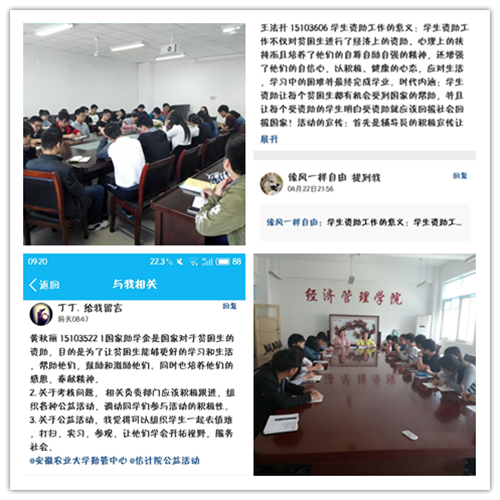 4月18日-4月27日期间,学院采用线上线下双渠道,学院内部与学院之间双平台,受资助生和公益活动负责人双角度的方式,针对资助工作展开讨论和交流。各专业班级通过召开专题讨论会,征集班级同学对资助工作的意见,整理总结讨论结果上报学院。学院组织公益活动负责人以及受资助生代表召开座谈会,就公益活动完成情况,助学金发放使用情况,资助工作意义等方面进行交流,并同步开启QQ讨论平台,共有200多人参与到话题讨论中。此外,我院联合经济管理学院举行了院间交流会,提出对学校资助政策的看法,针对公益活动完成过程中的问题以及如何创新性的开展公益活动等方面进行交流。本次活动通过三种讨论方式,使得学生参与性强,宣传覆盖面广。