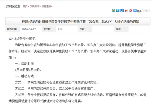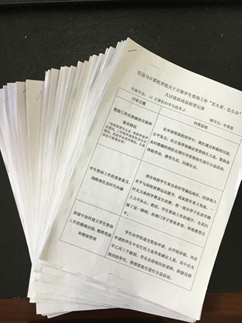 学院资助工作负责老师及时向班主任、班长、以及资助工作负责同学传达文件精神,围绕学生资助工作八个方面进行部署。通过学院网站、学院橱窗信息栏等多种渠道,认真做好宣传工作,让所有学生明确本次大讨论活动意在为深度探索学生资助工作的价值。