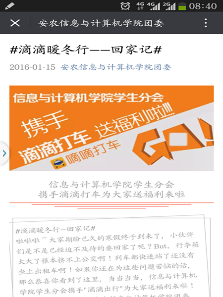 “滴滴暖冬行——回家记:滴滴一下,送你回家”活动在我校首次开展,在学院团委的号召组织下,已经有很多的安农大学生参与到此次活动中,不仅有公益活动组织者,更有许多学生当起了志愿者,在学校中招募需要帮助的学生,人人当起了爱心小使者。该活动不仅缓解了学生去车站的压力,同时也得到了学生的一致好评,向校园传递了关爱从生活滴滴做起的暖暖正能量。(王政 通讯员:刘飞)