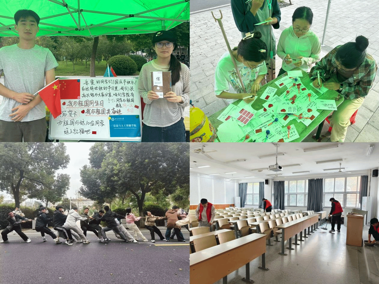 小我融入大我,青春献给祖国。10月19日,学院组织了一百多名新老学生会成员开展素质拓展活动,本次活动通过趣味拔河、八人九足、新中国史知识竞答等具体项目,旨在凝“新”聚力,营造爱国奉献,团结拼搏的氛围。10月20日,组织了50名志愿者开展楼宇美化清扫,清洁学院楼内外走廊、楼道、教室等场地,创造干净整洁的学习环境。10月24日,学院备战两个多月的运动员奋斗在校运会的赛场上,他们以运动之名,共筑青春梦想,用实际行动诠释了“青春献给祖国”的深刻内涵。