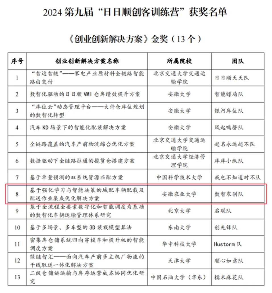 “数智农创队”队的课题是《基于强化学习与智能决策的城配车辆配载及配送作业集成优化解决方案》,方案从城市车辆配载与配送作业数智化转型赋能的角度,提出基于强化学习与智能决策的集成优化解决方案,构建了完整的智能决策系统,提升日日顺供应链在城市配送领域的智能化运营能力,为客户提供端到端的物流服务。