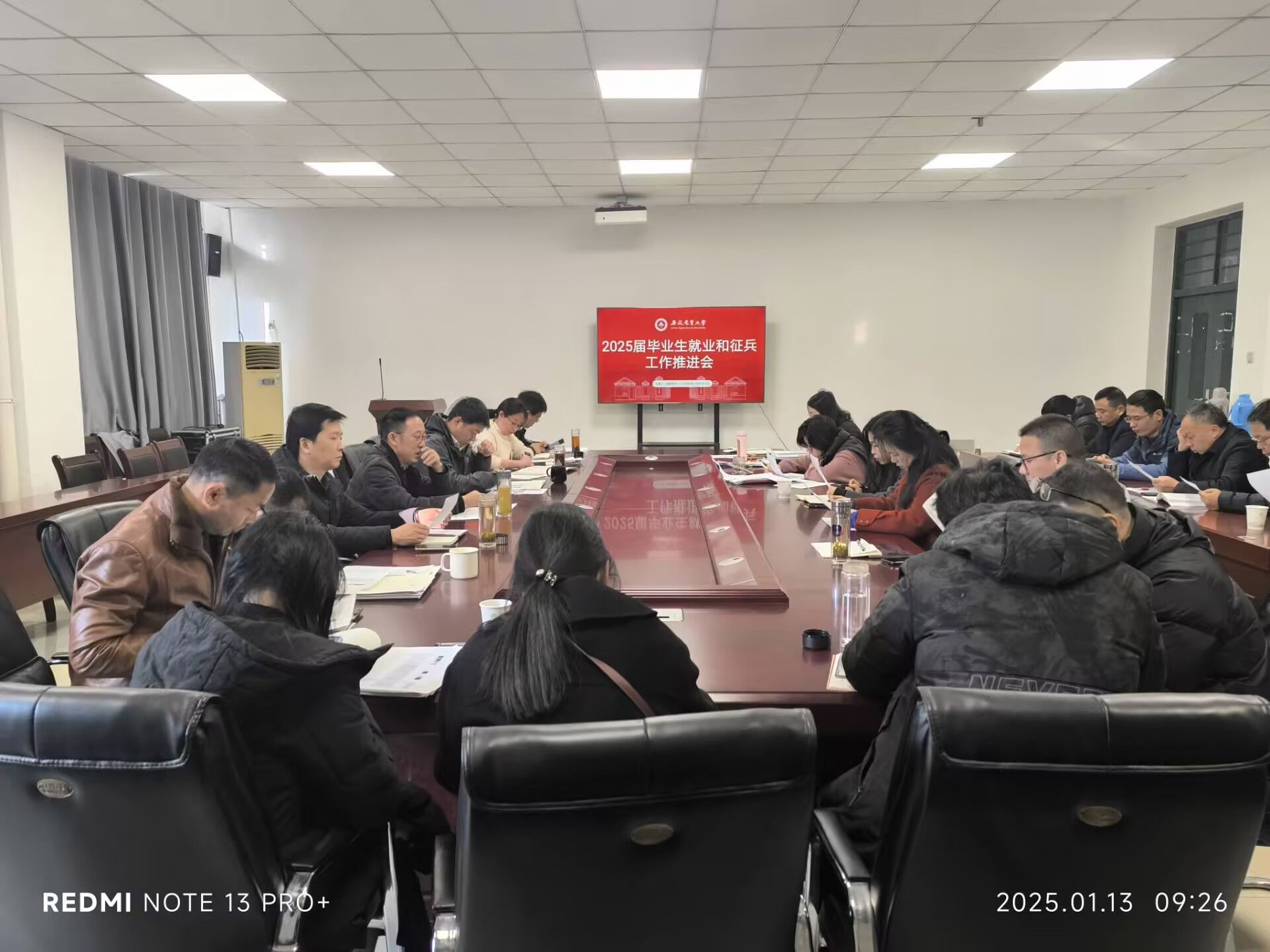 本网讯 1月13日,我院在203会议室召开了2025届毕业生就业和征兵工作推进会。会议由学院党委副书记、纪委书记李南飞主持,学院党政班子成员、各系部主任、2025届辅导员以及学院相关工作人员参加了会议。
