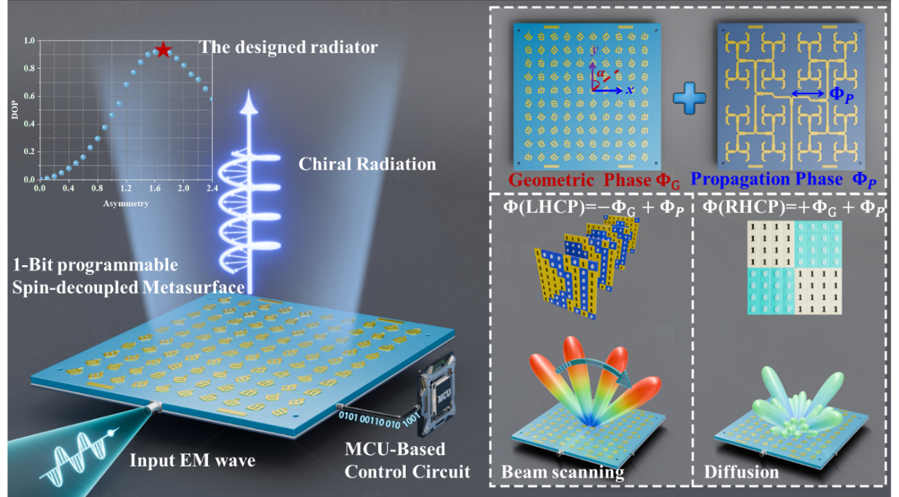 手性辐射因能够精确区分并操控电磁波的自旋态,在高灵敏度传感、偏振通信、量子信息处理等前沿领域具有重要意义。然而,现有器件普遍受限于结构固定和自旋耦合效应,导致极化纯度受损,难以实现高纯度手性辐射的动态调控。针对这一难题,研究团队创新性地提出了复合相位解耦策略,通过圆二色性与相位调制干涉,实现了目标方向的高效手性辐射,同时显著抑制了不需要的交叉自旋分量。进一步地,团队在辐射单元中集成PIN二极管,实现了主动相位调控与实时波束扫描。实验中,团队设计并加工了一种1比特可编程手性超表面,整体厚度仅为0.1倍工作波长。测试结果表明,该器件在±45°的宽角范围内实现了可调手性辐射,并保持优异的极化纯度,其3 dB轴比带宽达到10.4%本研究为高纯度手性辐射与方向性调控提供了一种集成化、可扩展的新途径,对智能通信、偏振成像及信息处理等领域具有重要意义。