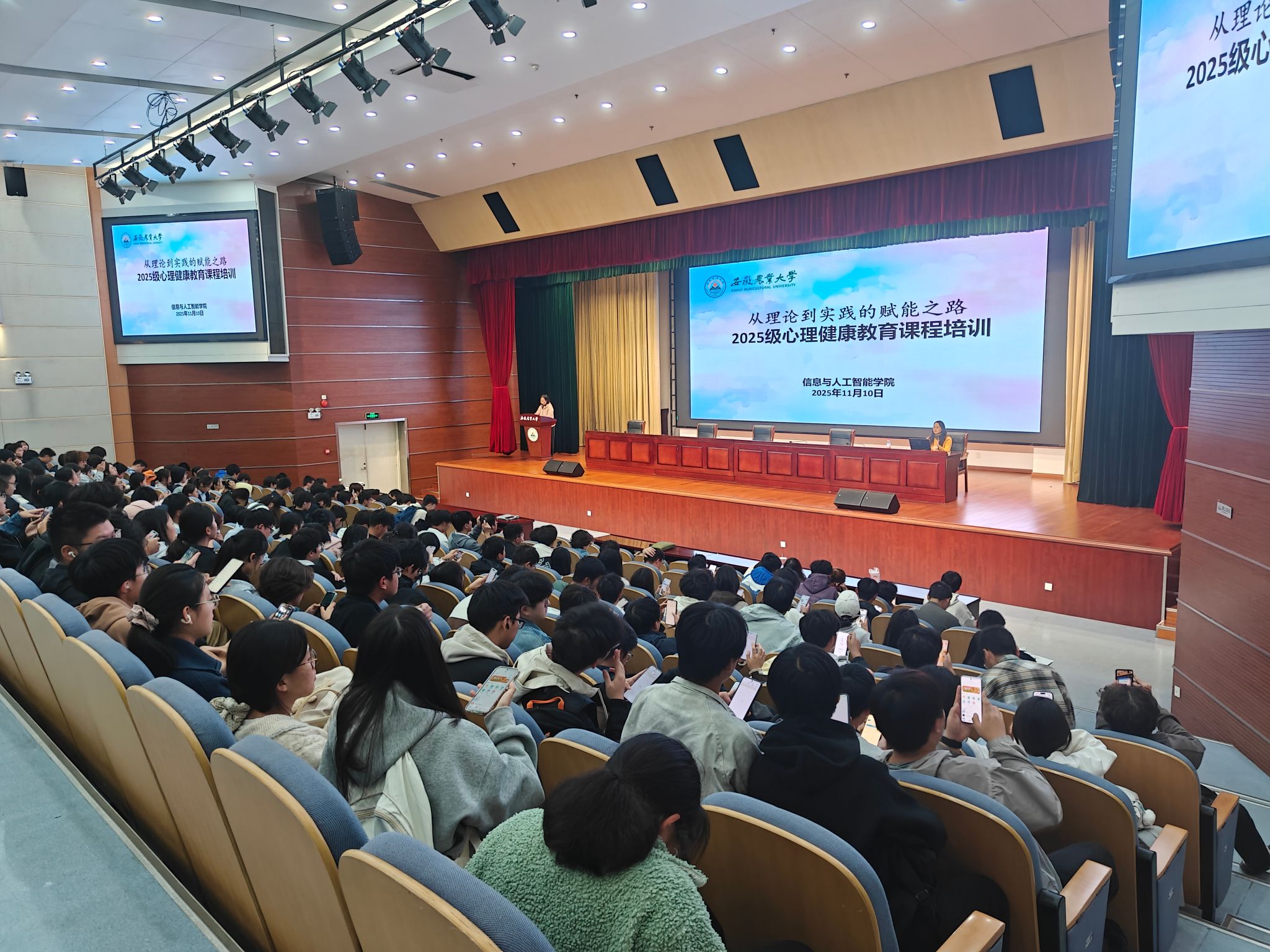 双重培训铸魂,夯实安全与心理的成长基石。学院高度重视学生安全意识与心理健康教育,面向25级新生开展了多层次培训。11月10日,学院举办了网络安全与反诈安全教育讲座。讲座由学院党委副书记李南飞主持,保卫处副处长徐传军结合校内真实案例,系统剖析了“兼职刷单”“冒充公检法”等高发诈骗类型,警示“两卡”出借风险。数据管理处副处长夏桂阳则聚焦无形的网络空间,讲授了恶意软件、网络钓鱼等常见威胁的识别与应对策略,引导同学们“会用网”更“慧用网”。当晚,学院心理工作站老师邓菁菁以“从理论到实践的赋能之路”为题,介绍了《大学生心理健康教育》课程体系,强调心理健康对个人发展的重要性,引导新生关注心理调适,为大学生活打下坚实的心理基础。