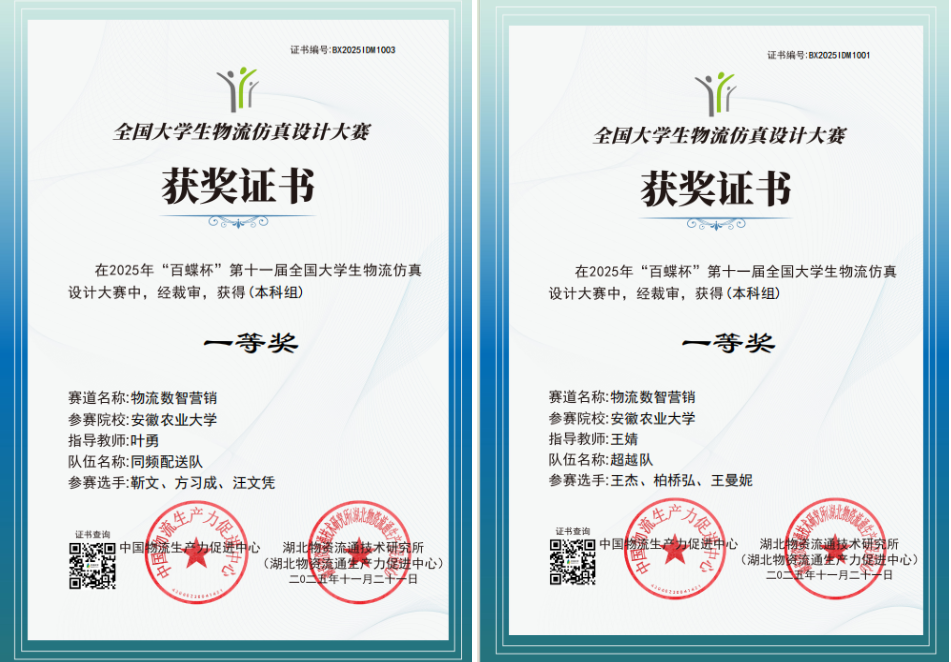 在参赛过程中,各参赛队伍同心聚力、密切协作,最终取得优异成绩。物流数智营销赛道上,“同频配送队”(靳文、方习成、汪文凭)、“超越队”(王杰、柏桥弘、王曼妮)双获一等奖;物流中心规划与运营赛道中,“大脚步迈进队”(李纯杰、张与能、阚康)摘得二等奖,“啊你说的队”(王宇旋、孙萍、李玉豪)获三等奖。