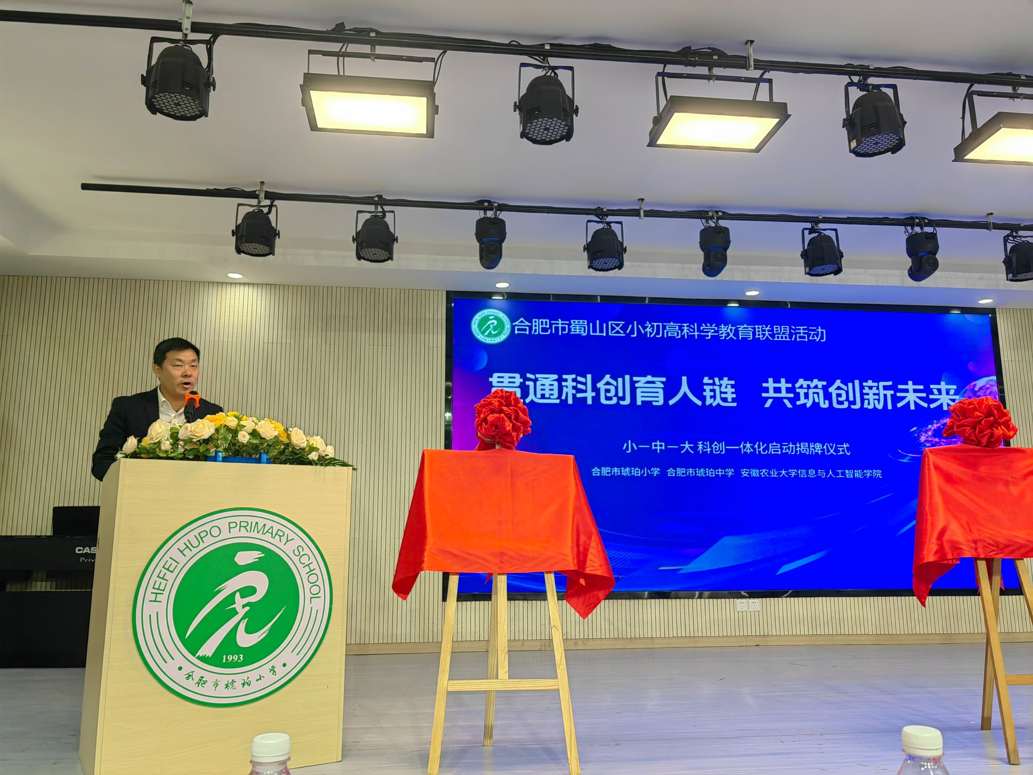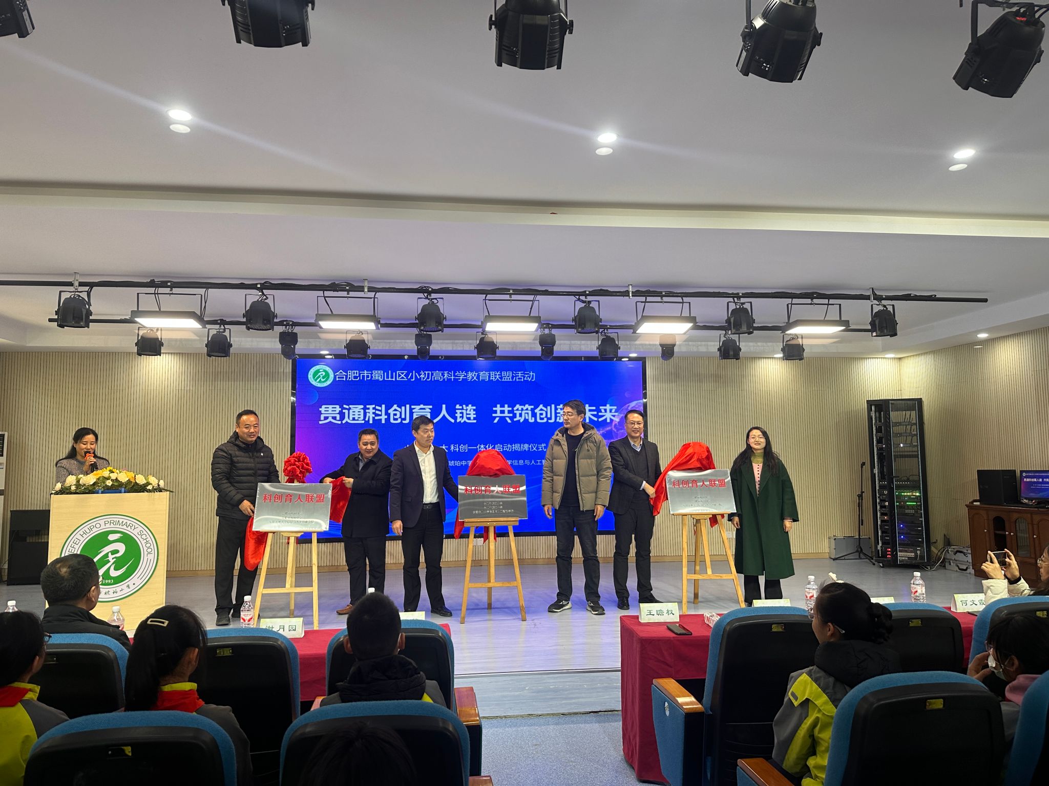 本网讯 为推动教育、科技、人才一体化发展,打通科创教育“小—中—大”衔接壁垒,构建贯通式科创人才培养体系,我院联合合肥市琥珀小学、合肥市琥珀中学教育集团成立“小中大科创育人联盟”。11月27日,联盟揭牌仪式在琥珀小学(西区)报告厅成功举行。蜀山区教育局副科长谢月园,蜀山区科学教育联盟领导小组常务副组长、合肥八中现教中心副主任鲍康胜,合肥市琥珀中学教育集团党委书记、校长王瞻权,合肥市琥珀小学党支部书记、校长徐诗友,信息与人工智能学院党委书记吴辰华等参加揭牌仪式。