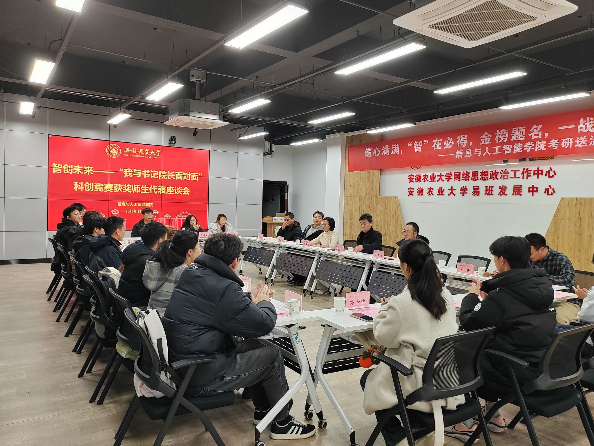 双创交流谋发展,科创比拼展风采。12月12日,“一站式”学生社区南区接连举办两场科创主题活动。在“我与书记院长面对面”创新创业师生代表座谈会上,获奖学生分享参赛心路与项目转化体会,教师代表交流指导经验与产学研融合思考,学院党委书记吴辰华,院长辜丽川,党委副书记、纪委书记李南飞,副院长岳振宇现场回应师生提出的困难与建议,共话学院双创生态建设。随后,校第十二届“兴农杯”大学生创业计划竞赛院赛答辩顺利开展,参赛团队展示创新成果,评委老师精准点评、悉心指导,为优质项目孵化与赛事备赛奠定坚实基础,激发学子科创热情与创新活力。