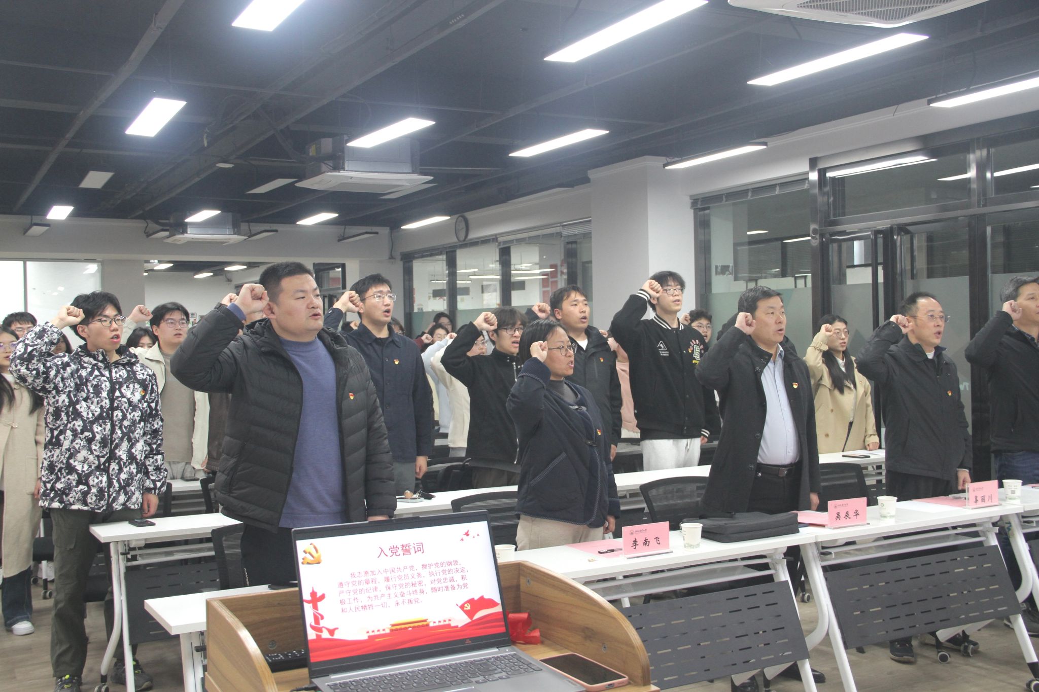 誓言铿锵淬初心,党建引领启新程。12月10日,“冬韵淬初心誓言启新程”入党宣誓仪式在南区“一站式”学生社区庄严举行。仪式在雄壮的《国际歌》中拉开序幕,学院副院长岳振宇宣读新发展党员名单,学院领导为新党员代表佩戴党员徽章。全体新党员面向党旗高举右拳,庄严宣誓,铿锵誓言彰显对党的无限忠诚。新党员代表陈昱浩分享入党初心与责任担当,老党员代表高梦晴传递奋斗经验。学院党委书记吴辰华提出铸牢忠诚之魂、锤炼过硬本领、厚植为民情怀三点要求,鼓励党员将个人发展融入党和人民的事业,为乡村振兴与农业强国建设贡献青春力量。仪式在庄严的国歌声中圆满落幕。