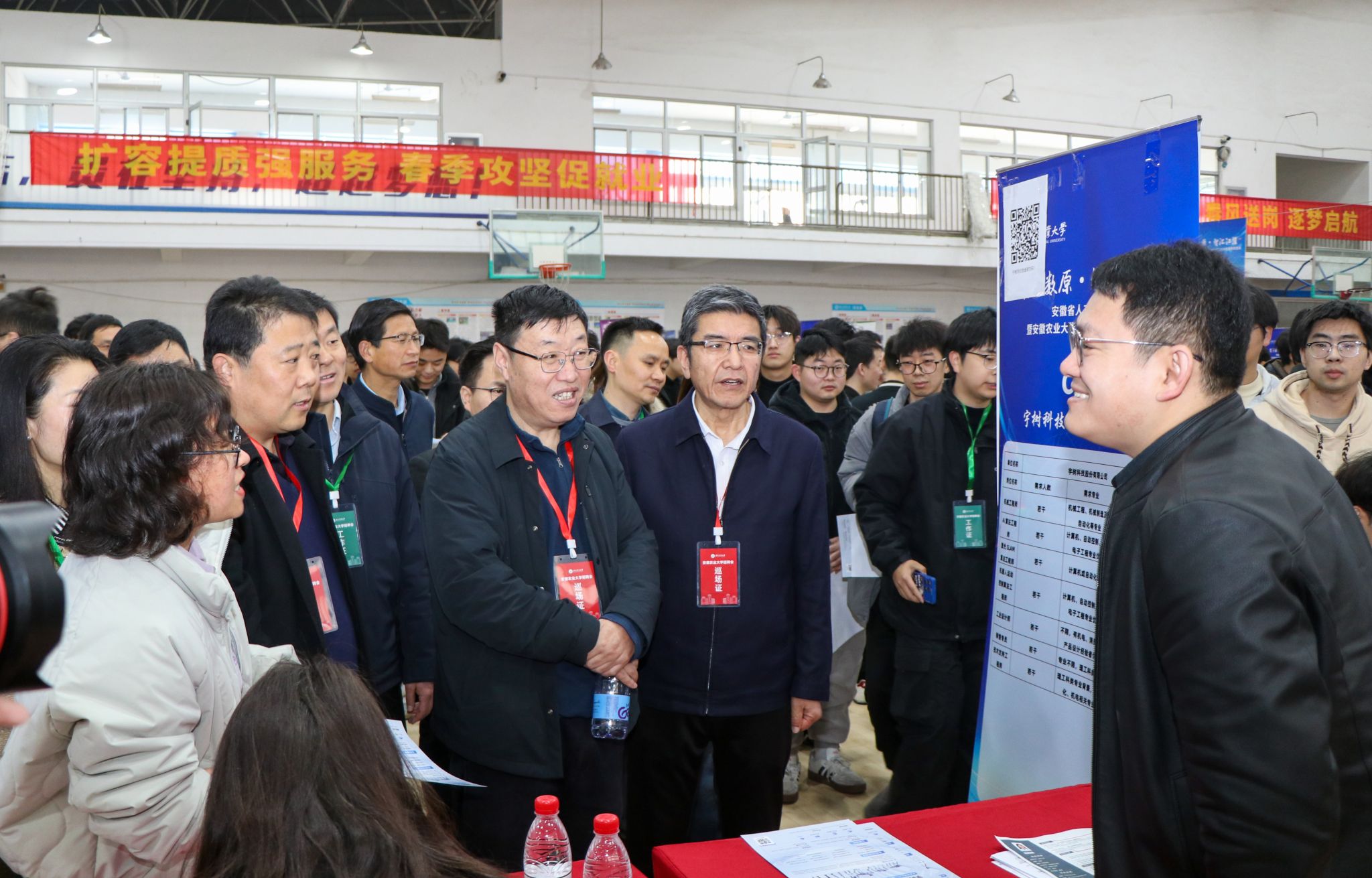 本网讯 3月21日,由我院与本科生院、电子与电气工程学院、机械与车辆工程学院联合承办的安徽省首届人工智能类双选会在校体育馆顺利举办。校党委副书记董雨、安徽省科技厅副厅长陈龙胜、安徽省大中专毕业生就业指导中心主任张秋田、安徽省计算机学会理事长陈恩红、安徽省教科文卫体工会二级调研员郑卫民等深入各招聘展位,与企业代表、求职毕业生亲切交流,详细了解岗位供需、求职意向及招聘进展情况。