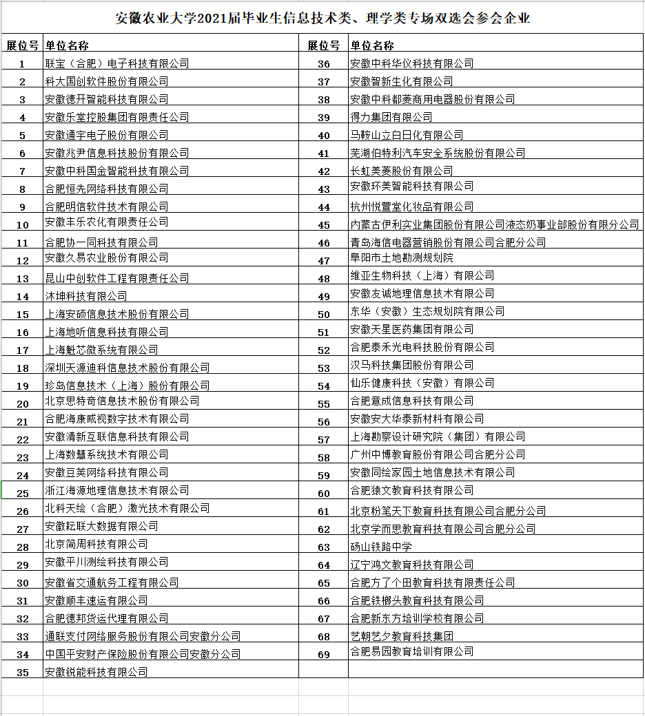 安徽农业大学2021届毕业生信息技术类、理学类专场双选会参会企业