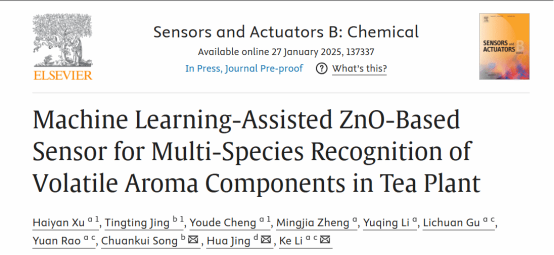 近日,我院李科教授联合茶树种质创新与资源利用全国重点实验室宋传奎教授等团队合作在传感器类期刊《Sensors and Actuators B: Chemical》发表了题为“Machine learning-assisted ZnO-based sensor for multi-species recognition of volatile aroma components in tea plant” 的研究论文。该论文首次报道利用半导体气体传感器阵列技术,结合机器学习算法,实现多物种茶树挥发性香气物质的种类识别和浓度预测,为茶叶品质的鉴定和茶树病虫害的早期预警与智能防治提供关键技术方法。