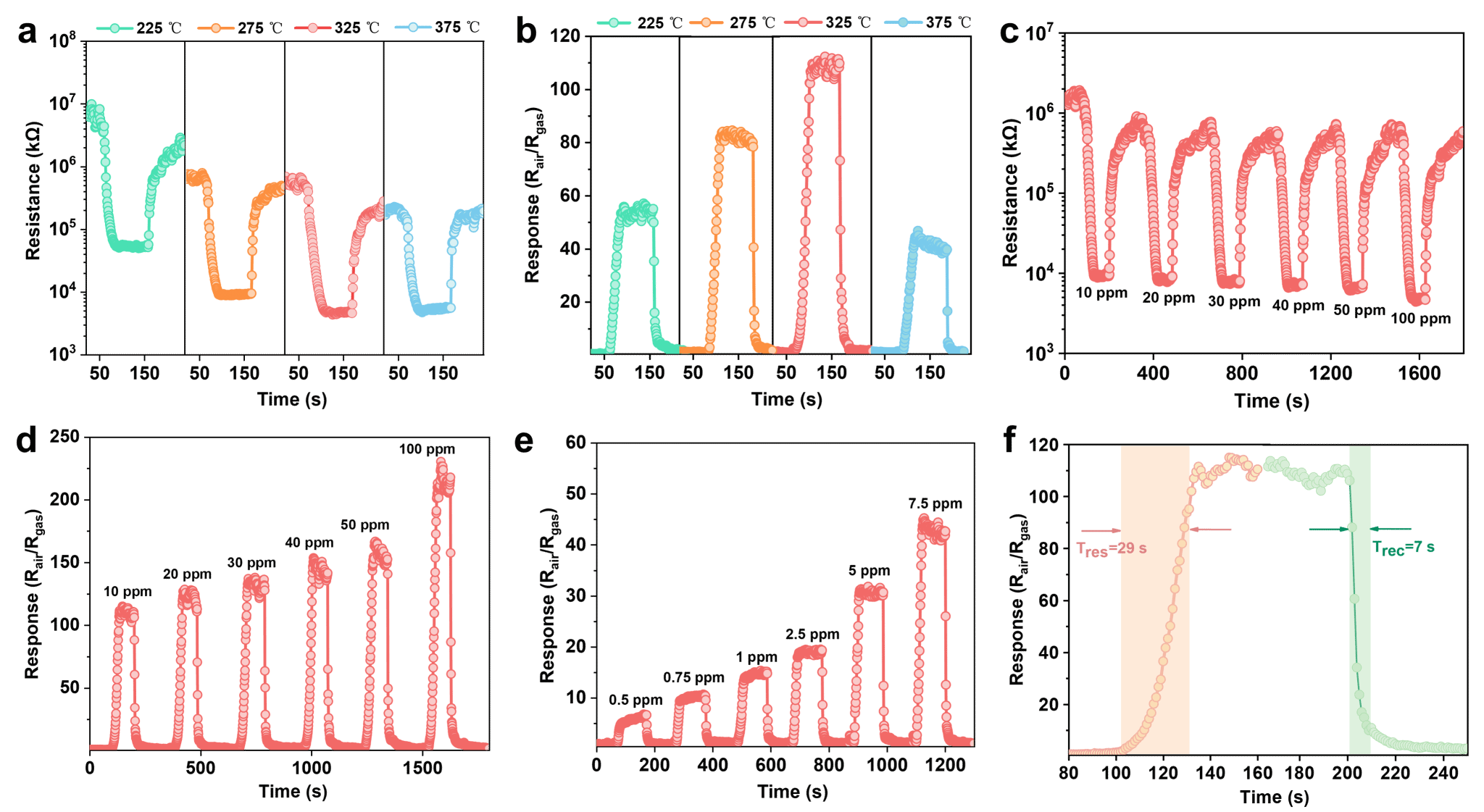 本研究通过制备一种氧化锌(ZnO)半导体气体传感器,实现叶醇、香叶醇、癸醛、辛醇、苯乙醇和水杨酸甲酯等挥发性香气物质的高灵敏检测。其中,该传感器对叶醇表现出极高的气敏响应。在325 ℃的工作温度下,对10 ppm叶醇的气敏响应值高达110,传感器的响应/恢复时间分别为29/7 s,最低检测限为0.5 ppm。此外,该ZnO半导体气体传感器具有良好的循环稳定性和长期稳定性。