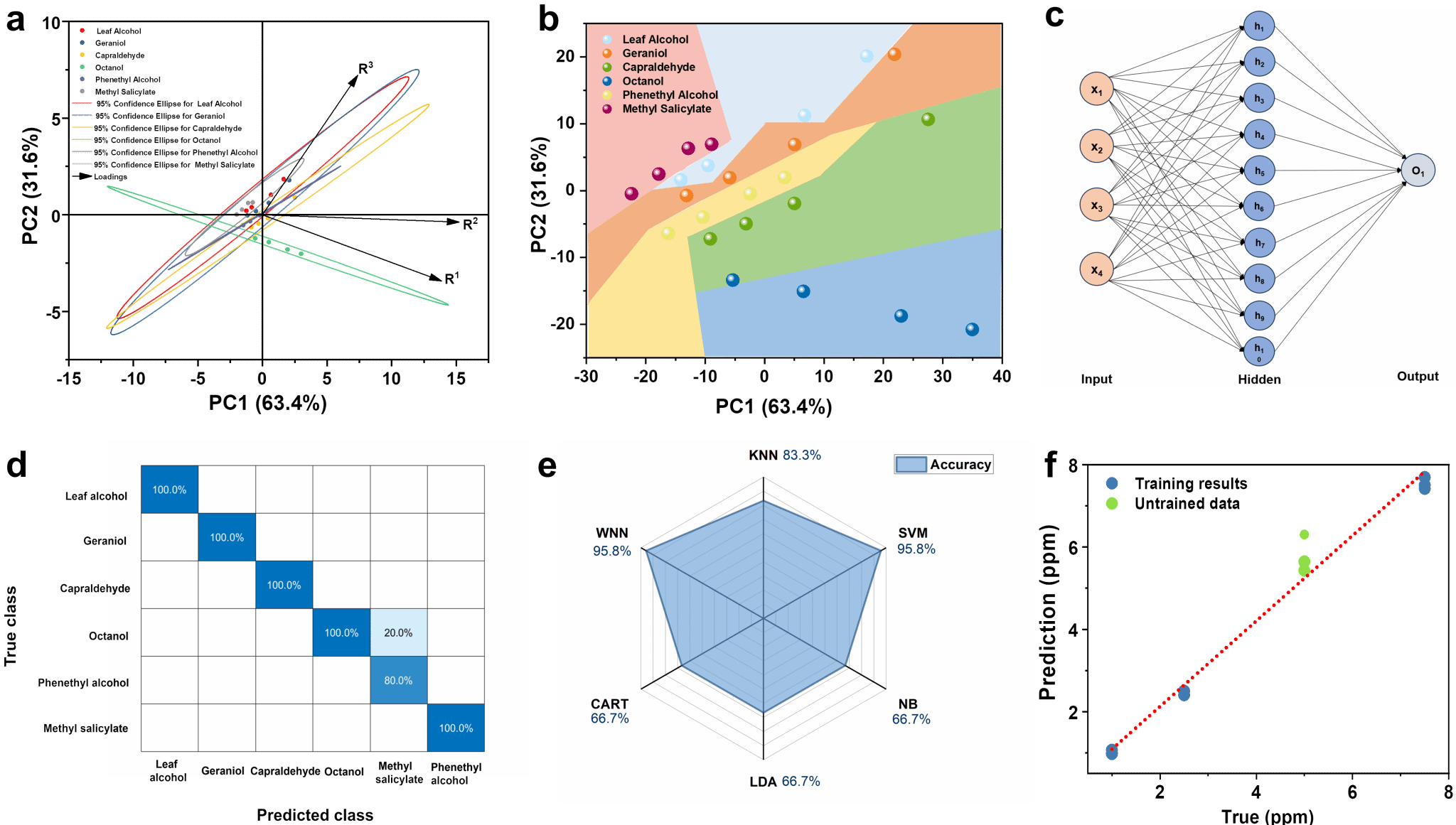 图3. 机器学习算法在挥发性香气物质种类识别和浓度预测中的应用。