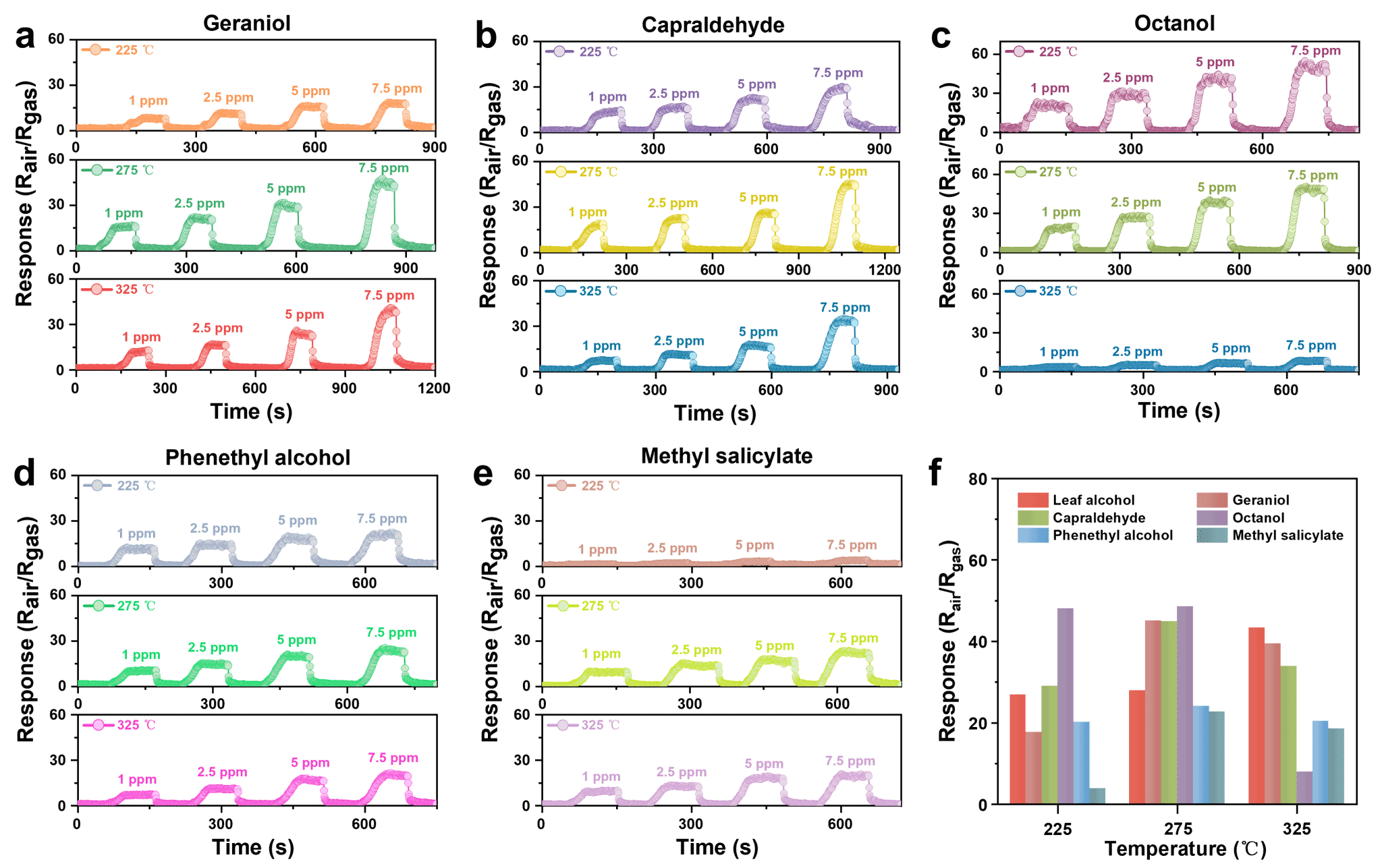 图2. ZnO半导体气体传感器在不同工作温度下对香叶醇、癸醛、辛醇、苯乙醇和水杨酸甲酯等挥发香气物质的气敏响应测试。